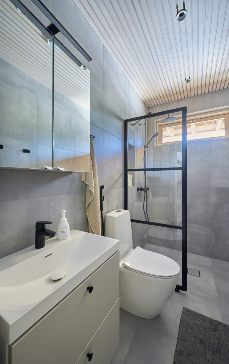Kodin kylpyhuoneessa ja WC-tilassa vallitsee raikas ja valoisa tunnelma, jota korostavat huolella valitut yksityiskohdat. Vaaleat pinnat tuovat tilaan avaruutta ja keveyttä, kun taas mustat hanat ja vetimet luovat kontrastia ja modernia ilmettä. Kylpyhuone ja erillinen WC on toteutettu samalla harmonisella tyylillä, mikä tekee kokonaisuudesta yhtenäisen ja harkitun.