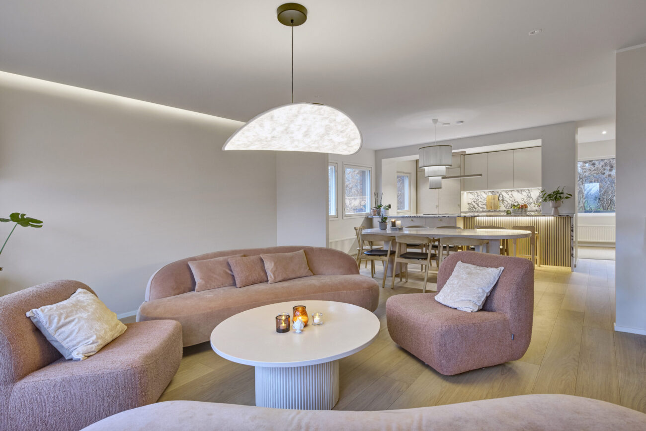 Laajassa kokonaisuudessa onnistuminen ei synny vain hyvistä tuotteista, vaan siitä, että suunnittelu kantaa läpi koko projektin. Heidi tuli vahvan näkemyksen kanssa ja halusi tehdä kodista omannäköisensä. Yhteistyön arvo näkyi siinä, miten ideat saatiin käännettyä mitoituksiksi, toimiviksi jaoiksi ja käytännön ratkaisuiksi huone kerrallaan.