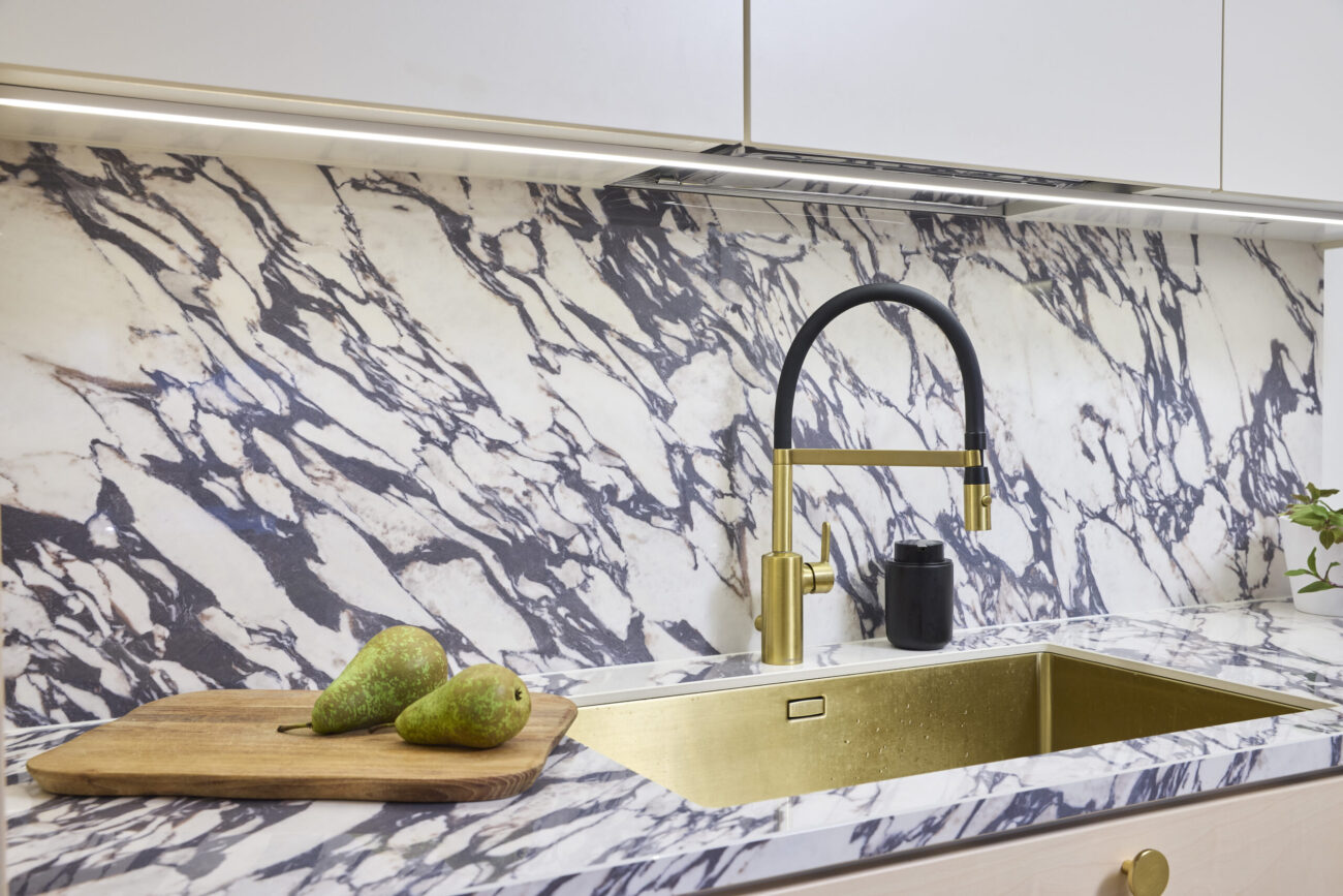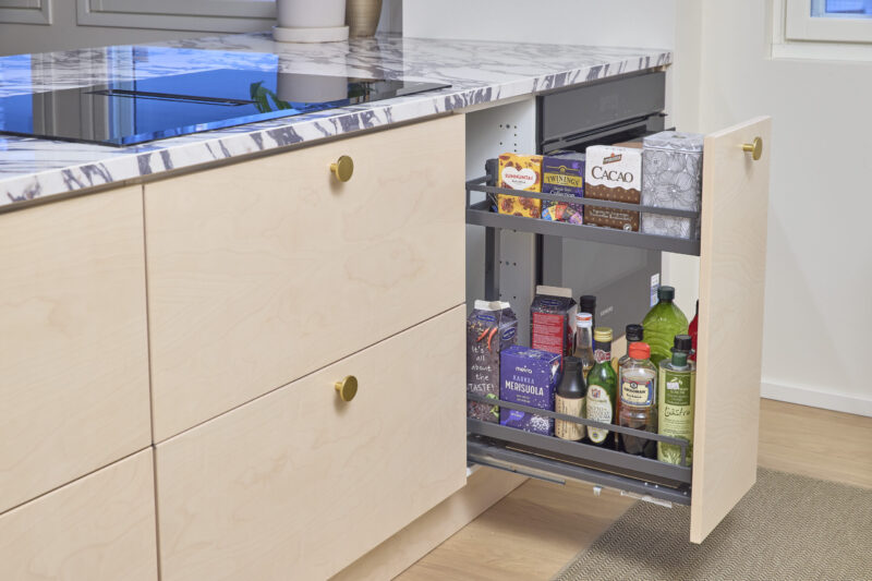 Keittiössä Heidi innostuu yksityiskohdista, jotka helpottavat käyttöä joka päivä. Kapeampi kaappi toimii heidän pantryna. “Kun kaappi ei ole syvä, kuivatavarat ovat näkyvillä ja käden ulottuvilla ilman kaivamista”, hän toteaa. “Myös leveä alalaatikko on ollut käytännössä iso juttu, koska suurimmat kattilat ja pannut saa sinne kerralla ilman jatkuvaa järjestelyä.”