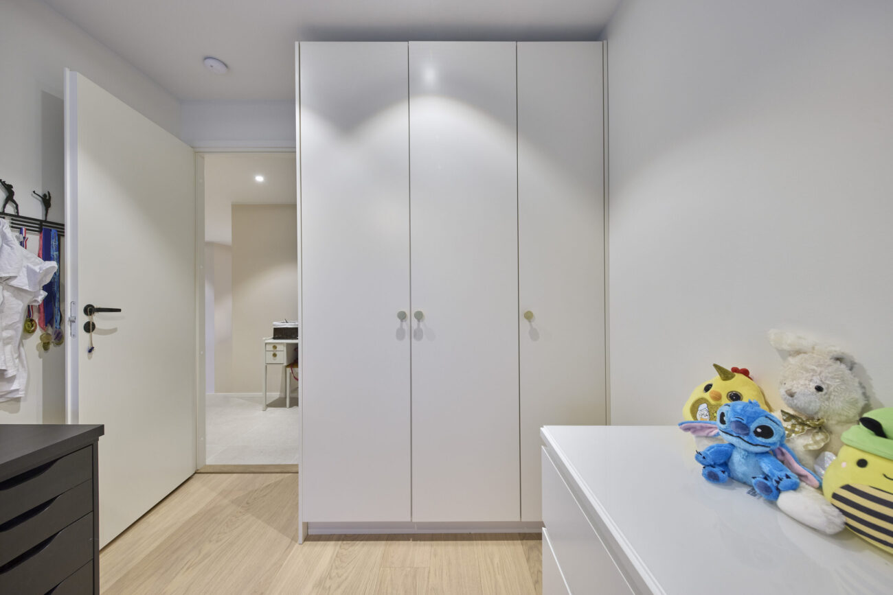 Toinen arjen selkäranka on vaatehuone. Heidi kuvaa sitä pelastuksena, koska tavarat eivät ole enää hajallaan, vaan yhdessä selkeässä kokonaisuudessa näkyvillä, jaettuna ja helppoina valintoina. “Se on helpottanut arkea valtavasti”, hän sanoo. “Kun vaatteet, kengät ja laukut ovat yhdessä paikassa, mikään ei jää pyörimään eri huoneisiin.” Myös pienet yksityiskohdat on huomioitu, esimerkiksi kalusteisiin upotettu kassakaappi on piilotettu niin, ettei sitä huomaa.