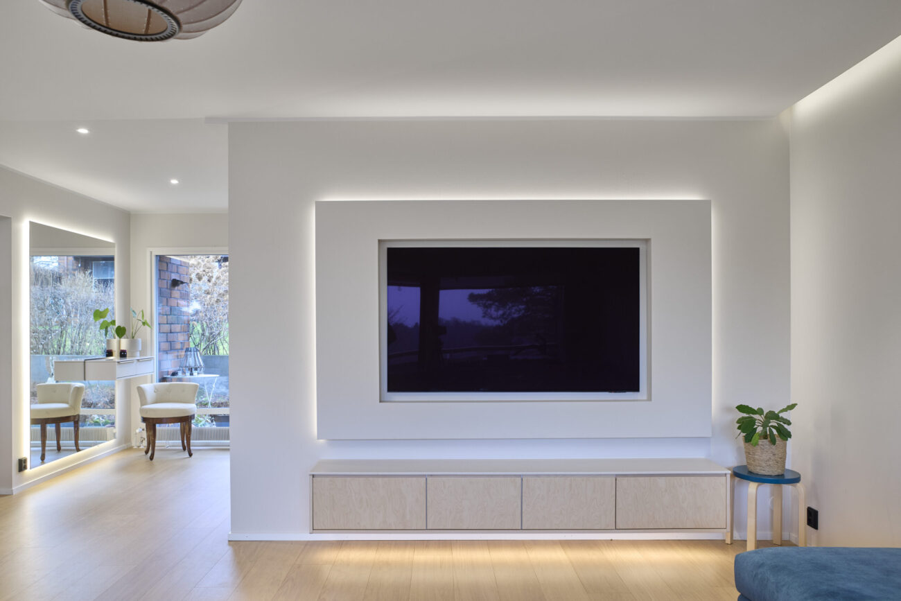 Myös tilojen roolit mietittiin tietoisesti. Isossa kodissa arki helpottuu, kun eri tilanteille on omat paikkansa: lapsille omaa tilaa, perheen yhteistä oleskelua ja lisäksi rauhallisempi olohuone vierashetkiä varten. Kun toimintoja on paljon, yhtenäinen kalustelinja ja sama ajatus säilytyksestä auttaa pitämään kokonaisuuden hallittuna.