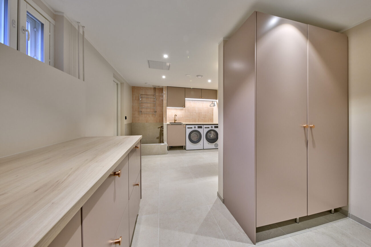 Keittiö on toki tärkeä, mutta Heidin mukaan arjen kannalta yhtä ratkaisevia ovat ne tilat, joissa rumba pyörii joka päivä: eteinen, kodinhoitohuone ja vaatehuone. Kun perusasiat toimivat, koko koti tuntuu sujuvammalta. Charmia Vantaa toteuttikin kalusteet peräti kolmeentoista eri tilaan.