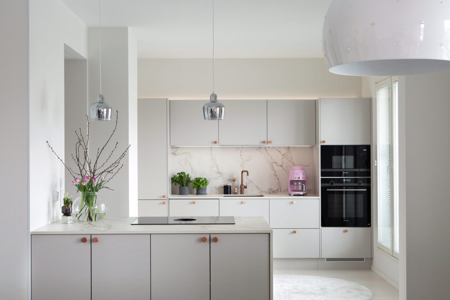 Tässä keittiössä yksityiskohdat ovat tyylikkäät kuparin väriset vetimet, tiskiallas sekä hana. Sävyt sointuvat kauniisti yhteen marmorikuvioisen tason sekä välitilan kanssa, noudattaen tuoreimpia keittiötrendejä.