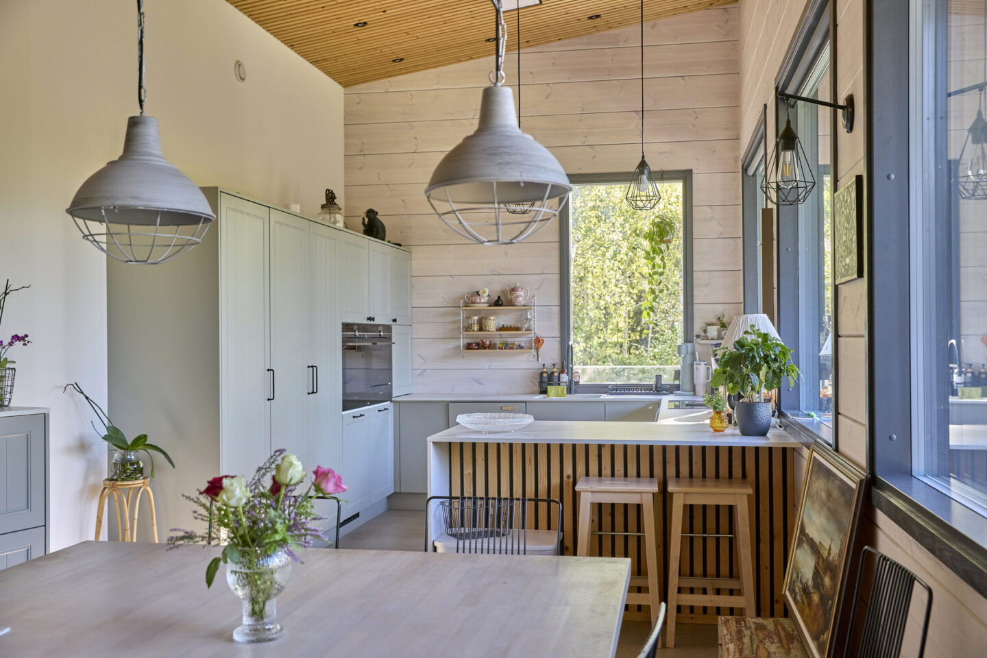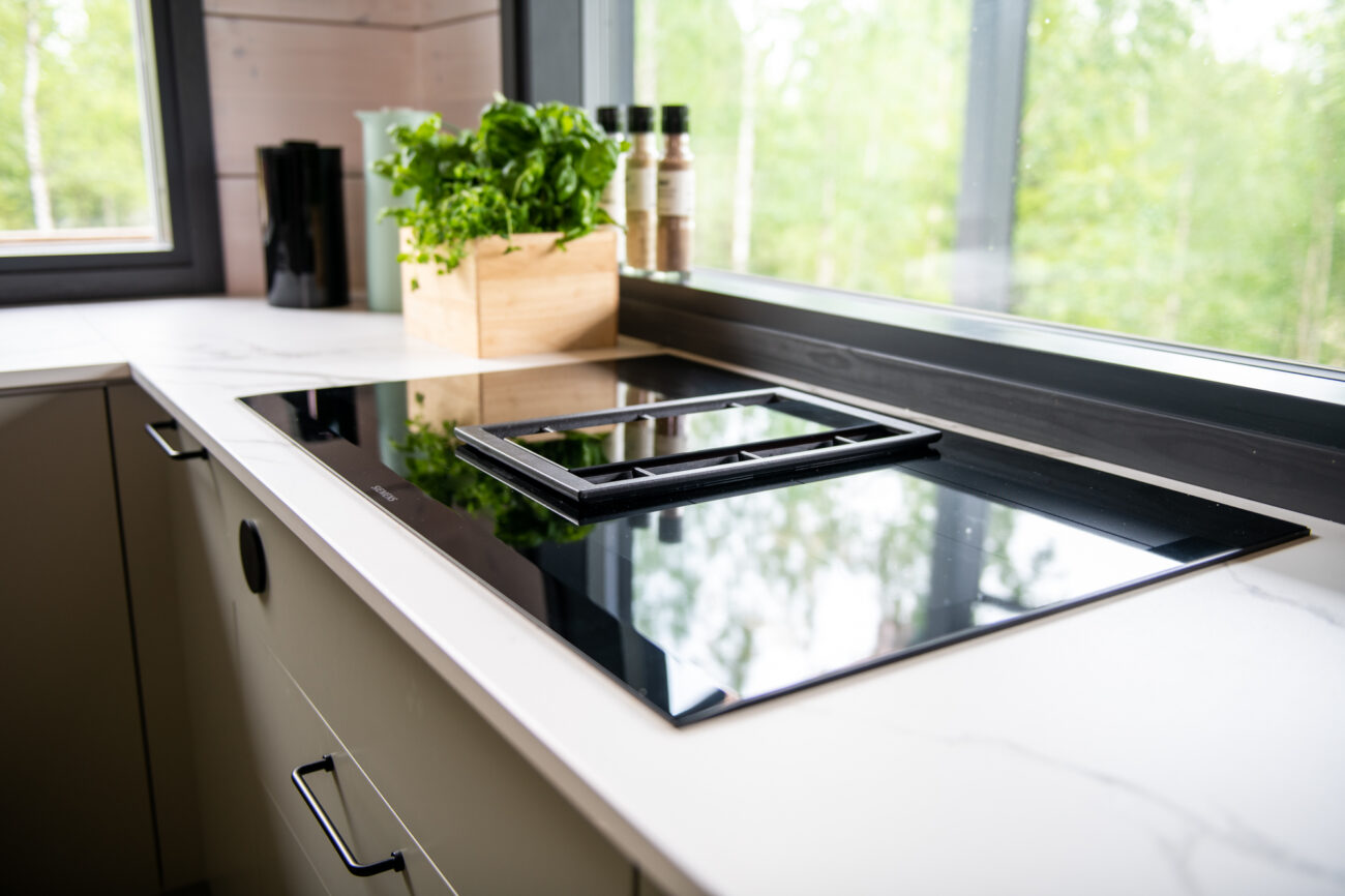 Ikkunan eteen sijoitettu liesi tuo ruoanlaittoon uuden ulottuvuuden, sillä kokatessa voi katsella pihamaisemaa. Tasojen muodostama pieni niemeke toimii luontevana paikkana nopeille aamiaisille ja välipaloille – hetkille, joissa arki ja yhdessäolo kohtaavat. Suuri ruokapöytä kokoaa perheen yhteen niin arkena kuin juhlassa.