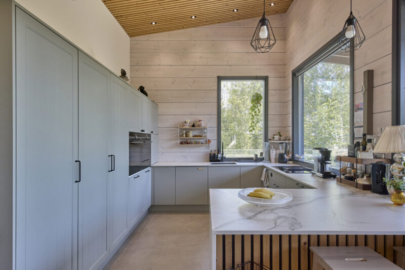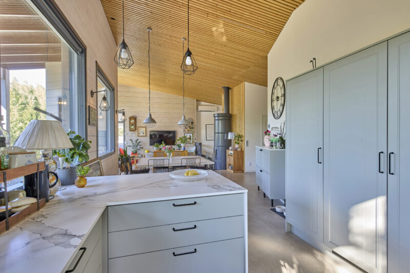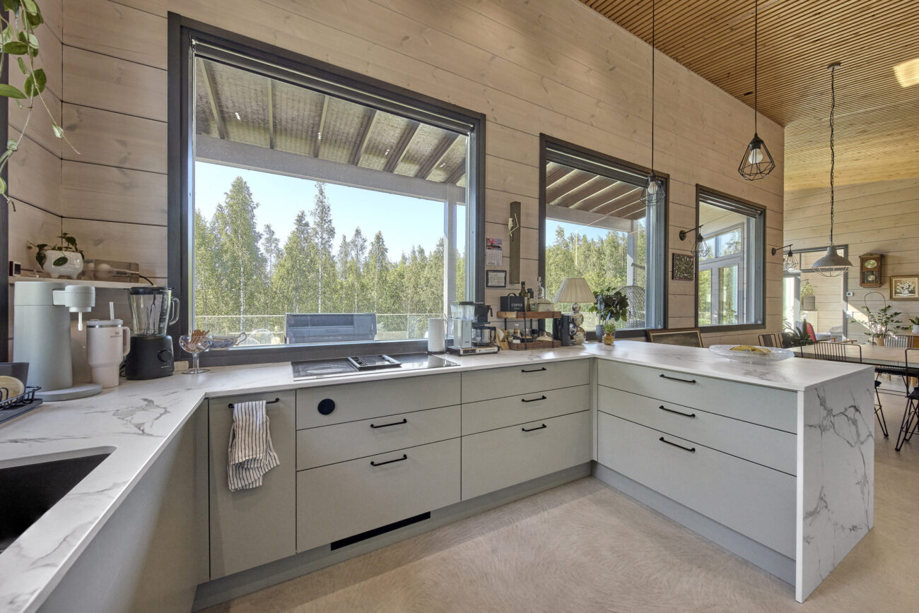 Yläkerran avara oleskelutila keittiöineen on kodin keskipiste. Sammaleenvihreillä Charmia-kalusteilla toteutettu keittiö on selkeälinjainen ja yläkaapiton, mikä korostaa tilan avaruutta. Työtilaa on runsaasti, ja ratkaisut on suunniteltu käytännöllisyys edellä. Korkea tila tuo oleskelualueelle ilmavuutta ja tekee siitä luontevan kokoontumispaikan.