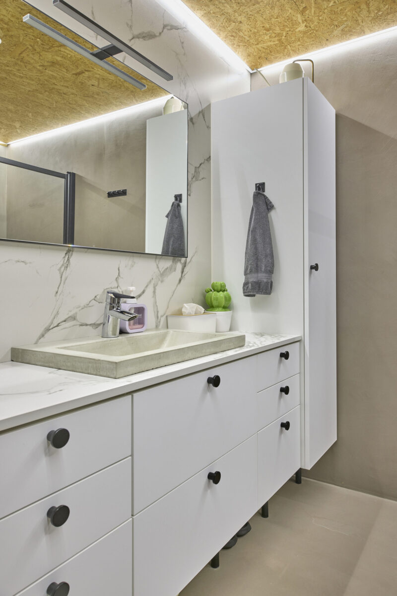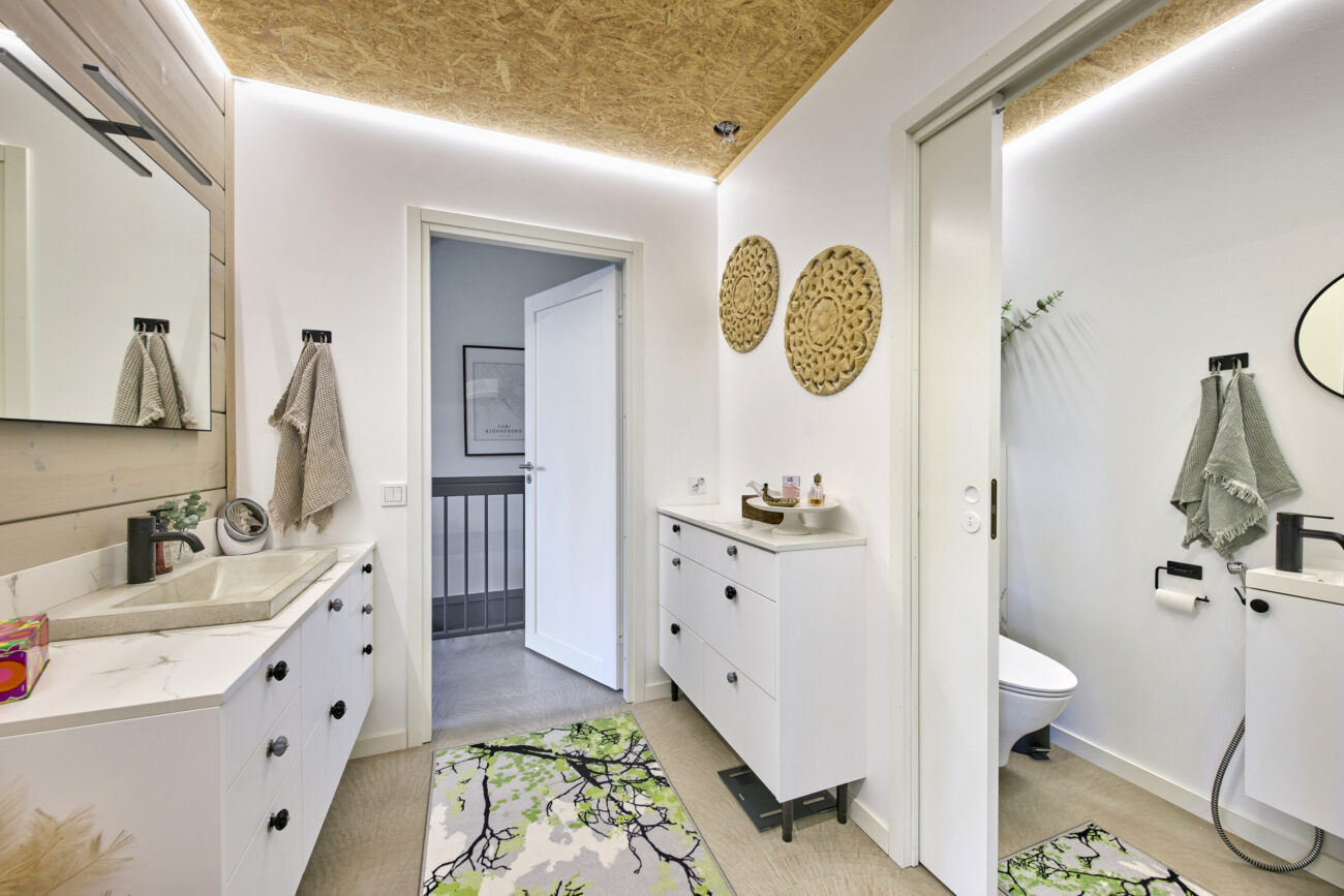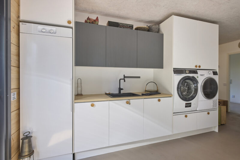Keittiön lisäksi kaikki kodin muutkin kiintokalusteet ovat Charmian valmistamia. Kylpyhuoneissa kalusteet tuovat selkeyttä ja säilytystilaa, ja kodinhoitohuoneessa ratkaisut helpottavat perhearkea huomattavasti. Yhtenäinen suunnittelu näkyy materiaalien ja sävyjen harmoniassa.