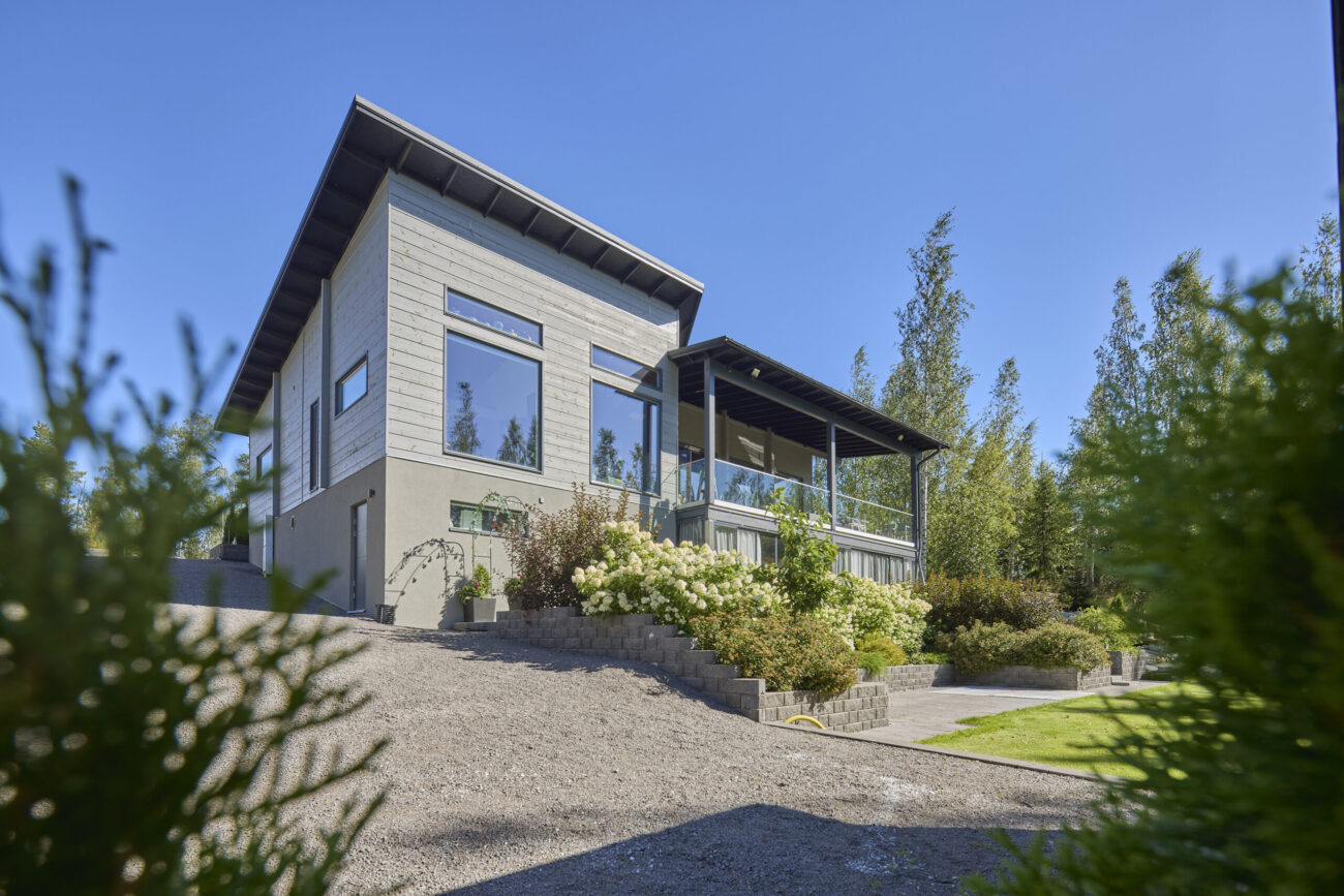 Kodin tarina alkoi aikanaan hetkestä, jolloin Sami näki puiden takaa kallioisen rinnetontin ja ymmärsi heti paikan mahdollisuudet. Ajatus omasta, itse rakennetusta kodista syttyi nopeasti, vaikka projekti tuntui aluksi suurelta. Poikkeuksellisen suuri tontti tarjosi kuitenkin tilaa unelmoida isosti ja rakentaa koti, jossa olisi väljyyttä ja monipuolisia tiloja koko perheelle.