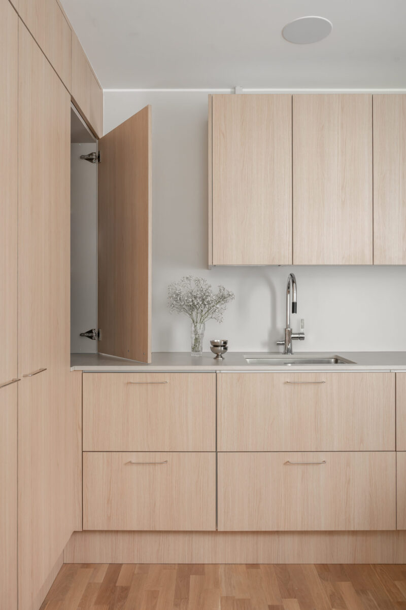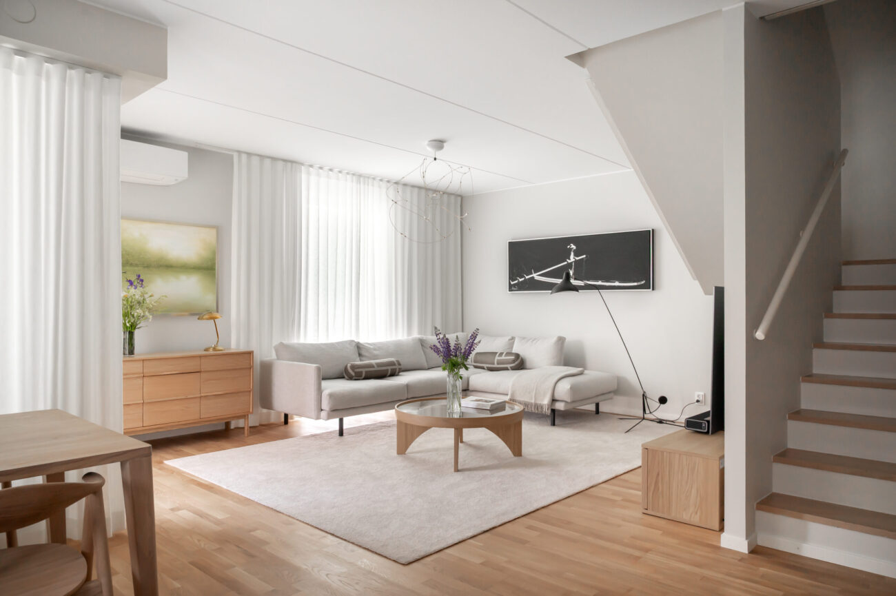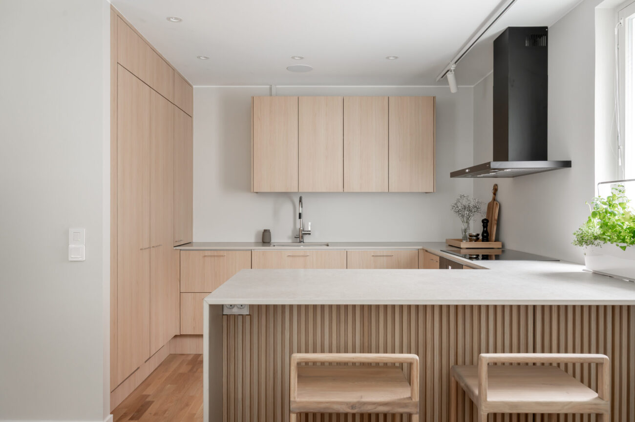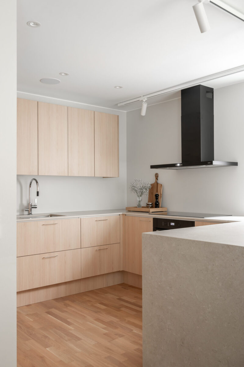 Uuden kodin ostaminen käynnisti Jätkäsaaressa ison projektin: asunto remontoitiin käytännössä lattiasta kattoon ja samalla uusittiin keittiö sekä muut kiintokalusteet. Tavoitteena oli tehdä kokonaisuus, joka toimii arjessa, näyttää rauhalliselta ja selkeältä – ja ennen kaikkea valmistuu kunnianhimoisessa aikataulussa.