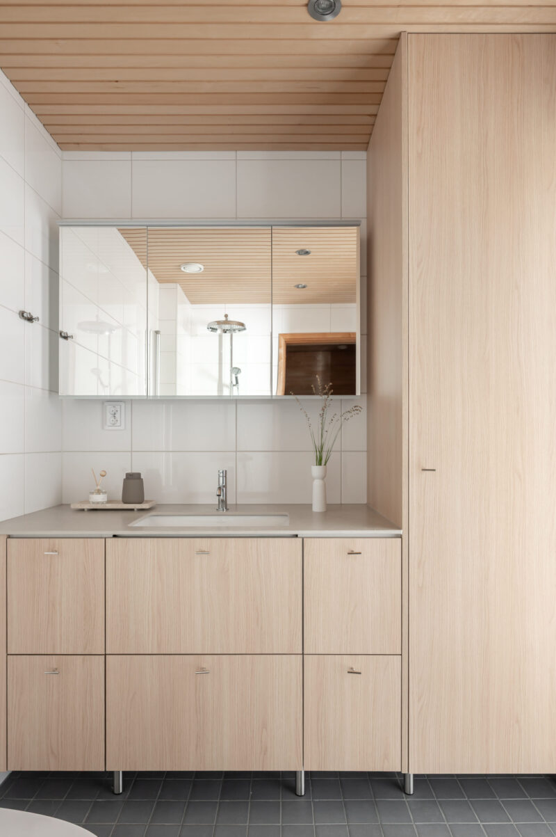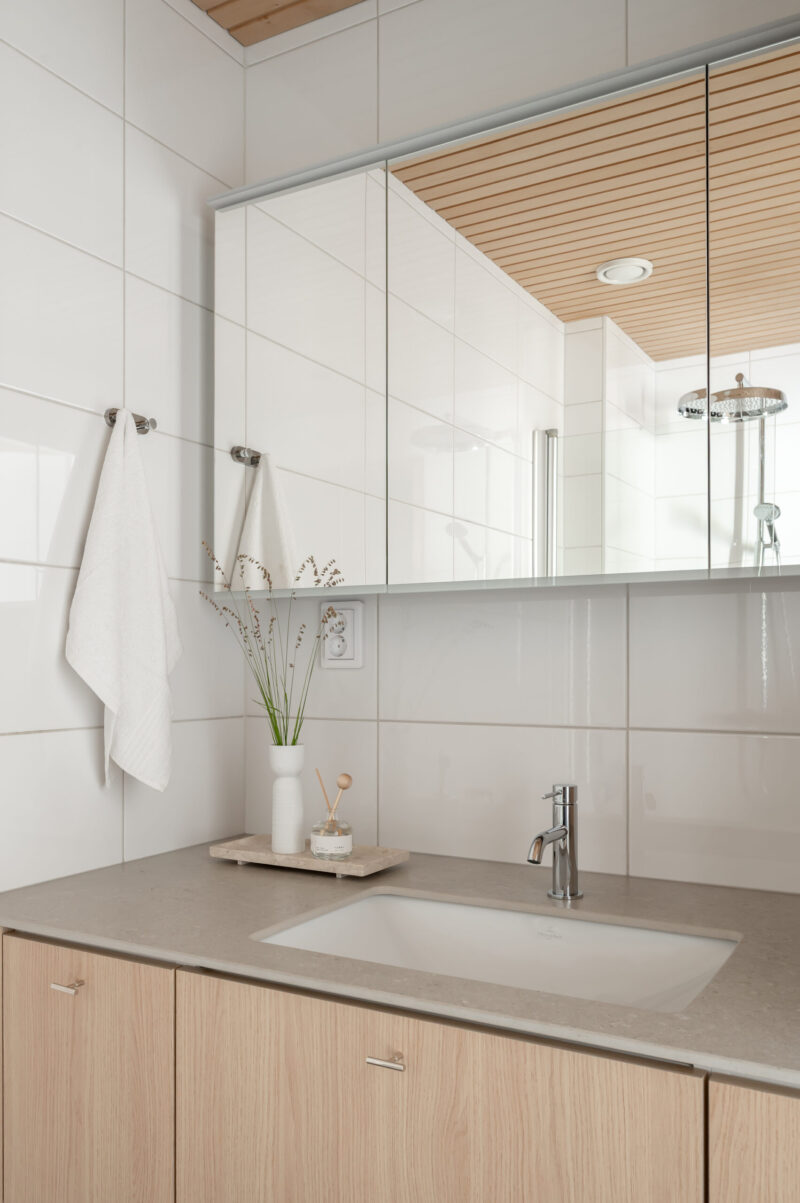 Tyylissä jatkettiin samaa rauhallista ja skandinaavista linjaa kuin muualla. Kalusteissa korostui vaalea tammi -henkinen sävymaailma ja puupinnat, mutta märkätiloissa valinnat tehtiin käytännöllisyys edellä. Materiaalipäätöksistä kiinnostavin tarina syntyi kalusteiden pinnoista: asiakkaalla oli aluksi vahva ajatus tammiviilusta, mutta arjen realiteetit, kuten lapsiperhe ja märkätilojen kuormitus, käänsivät valinnan melamiiniin. Perhe ilahtui siitä, miten laadukkaalta melamiini näyttää. Tekstuuri ja viimeistely ovat niin tasokkaita, ettei eroa edes huomaa aidosta luonnonmateriaalista.