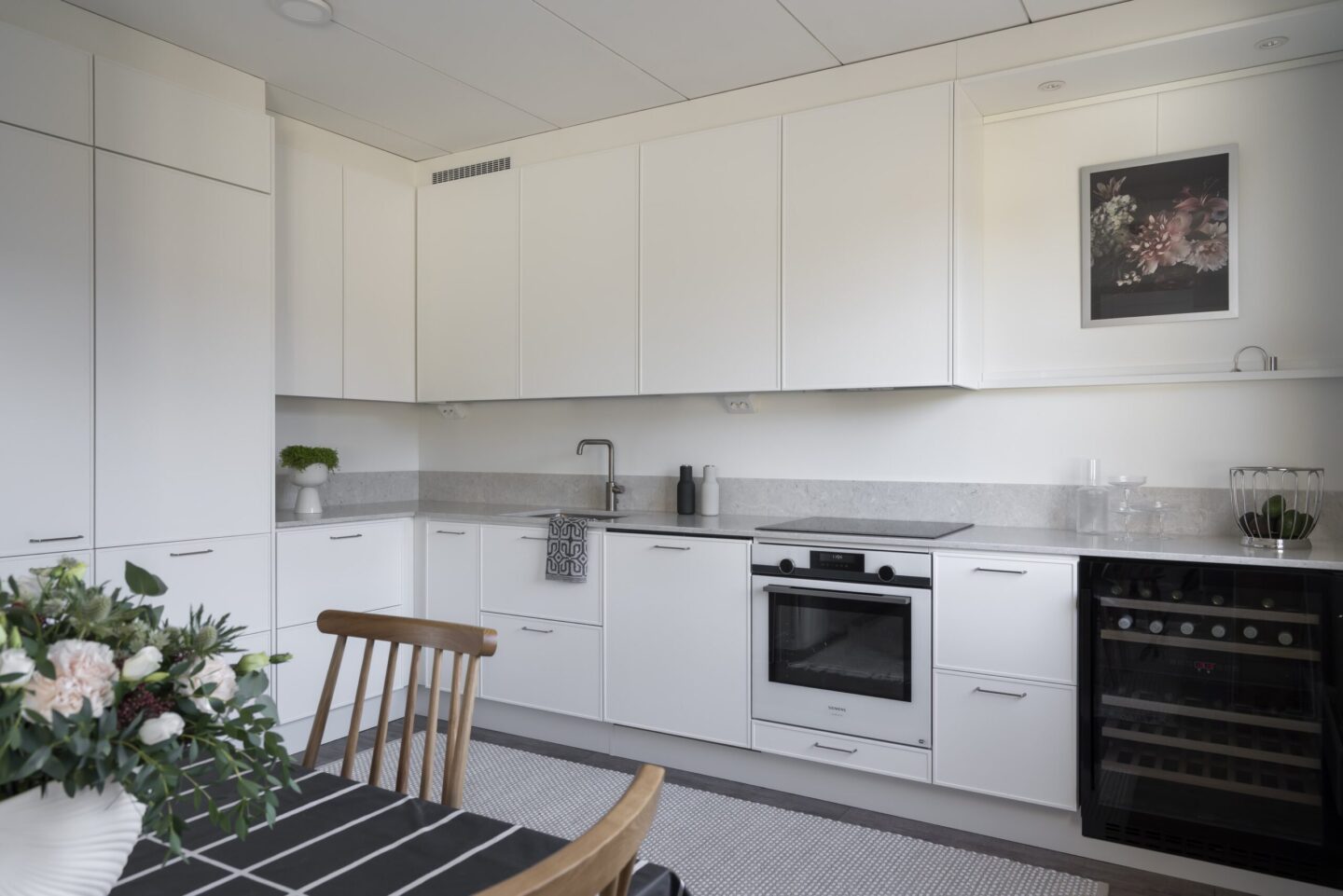 Keittiön pohjapiirustusta muutettiin, jotta tila palvelisi pariskuntaa parhaalla mahdollisella tavalla. “Ovi käytävään suljettiin. Sillä tavoin keittiöstä saatiin avarampi ja toimivampi”, Eeva kertoo. Muutos oli iso, mutta on osoittautunut toimivaksi. Myös näkymä olohuoneesta keittiöön haluttiin rauhalliseksi ja pehmeäksi. Yläkaappien sijaan olohuoneeseen avautuvaan kohtaan sijoitettiin katseenvangitsijoiksi viinikaappi ja taulu. Siten myös oikealla seinustalla olevasta ikkunasta pääsee kaikki valo keittiöön. “Sitä emme olisi itse hoksannut ottaa huomioon”, Eeva kiittelee suunnittelijaa.