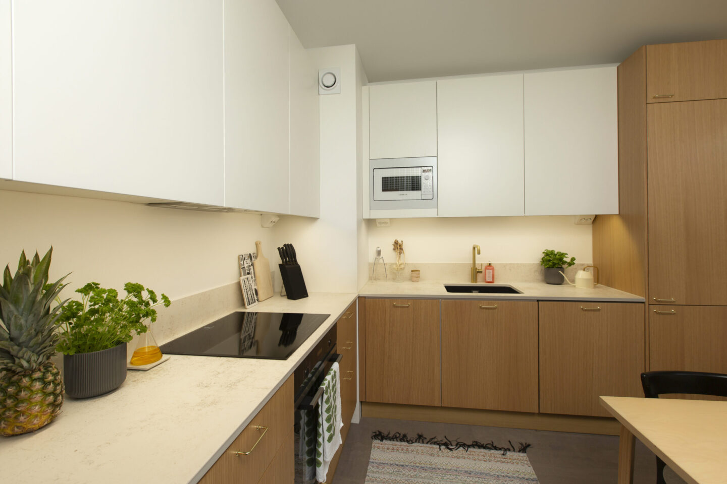 - Laatikot ja tavaroiden sijoittelu mietittiin niin, että myös perheen lapset pystyvät toimimaan itsenäisesti keittiössä. Esimerkiksi lasit, mukit ja lautaset ovat alakaapin vetolaatikoissa, eikä yläkaapeissa.