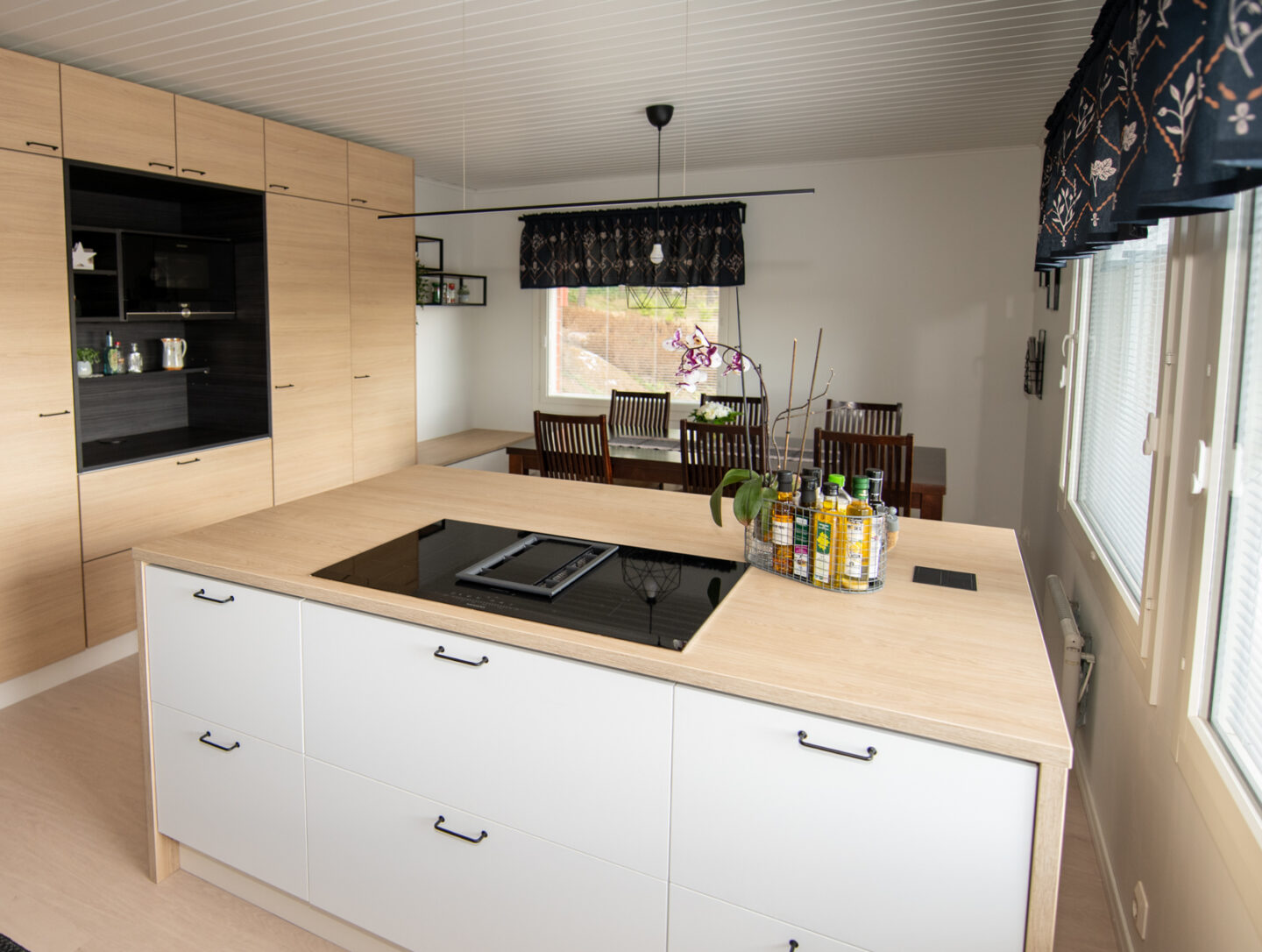 – Koska puuhellassa oli mustia yksityiskohtia, halusin keittiöön jotakin mustaa. Tammen ja mustan yhdistelmä tuntui taas liian tummalta, jolloin otimme myös valkoista mukaan kaapinoviin ja saarekkeeseen, tuumaa Emmi.