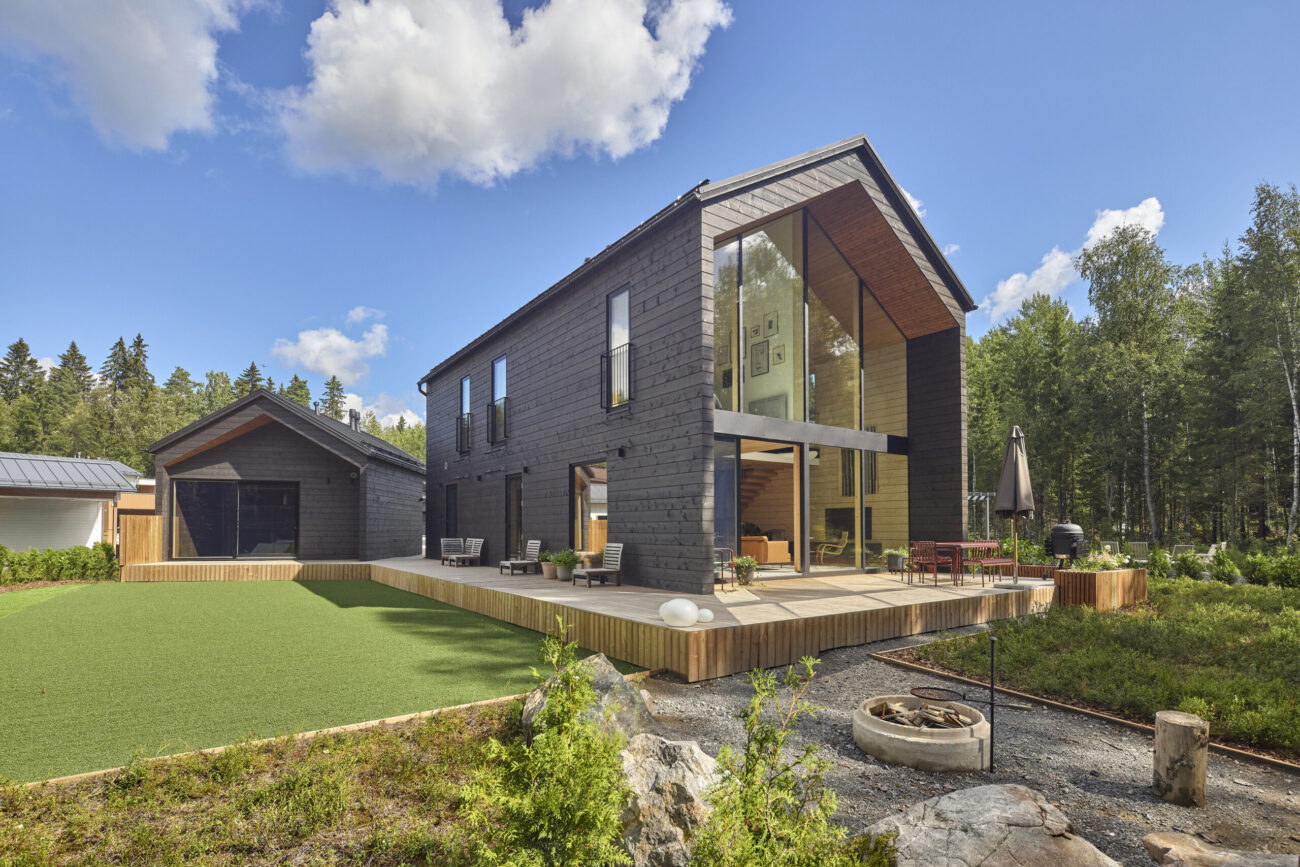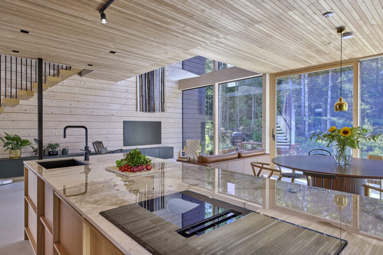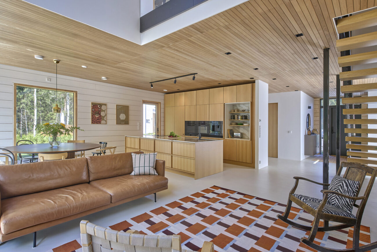 Perhe kaipasi enemmän väljyyttä ja yhteisiä isoja tiloja, joissa arki voisi soljua rauhallisemmin. Henna kiteyttää heidän tavoitteensa kodille kauniisti: ”Minulle on tärkeää, että arki on täynnä myös kauniita hetkiä. Koti ei saa olla pelkkää suorittamista, vaan sen pitää tuoda esteettisyyttä ja nautintoa kiireen keskelle.” Luonto houkutteli heitä pois keskustasta ja nyt suurista ikkunoista avautuu näkymä metsään.