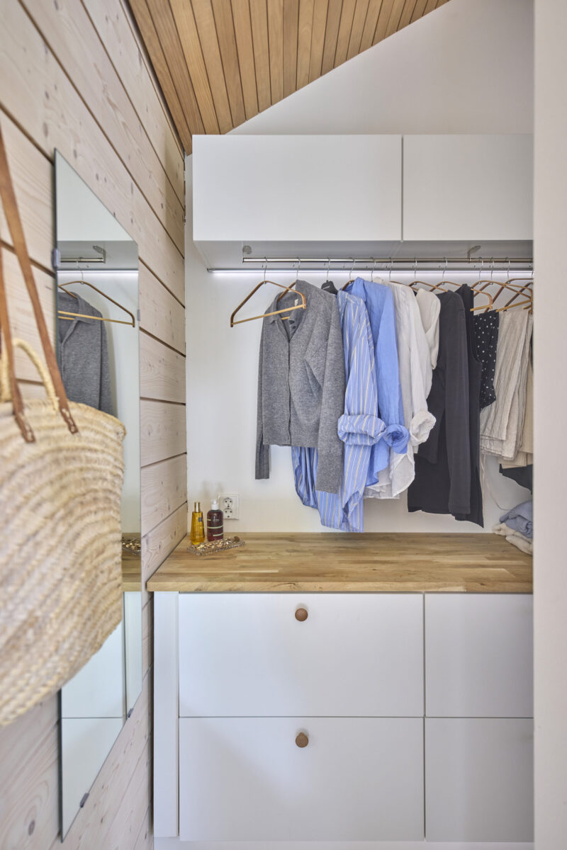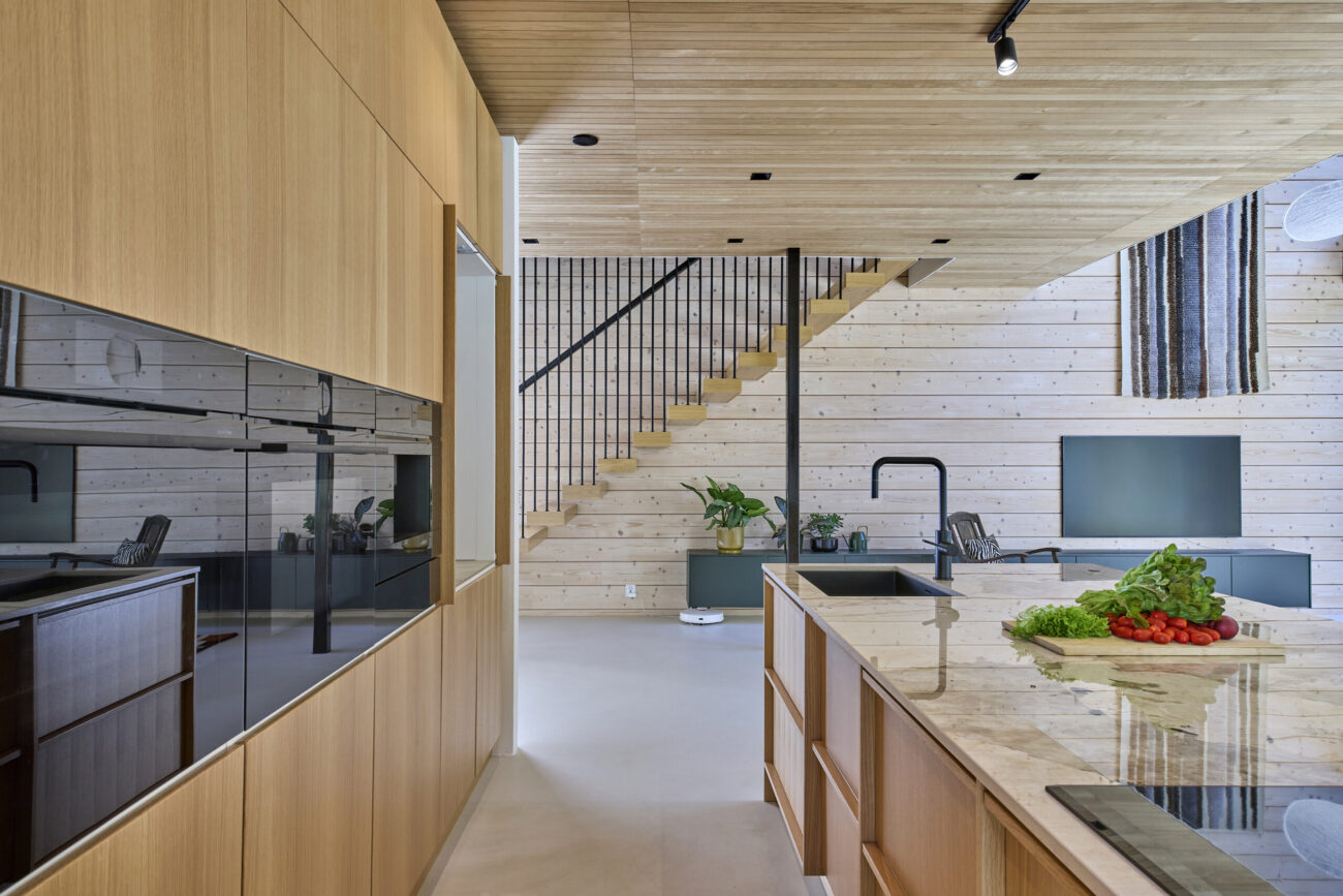 Kokonaisuuden suunnittelussa ei menty helpoimman kautta. Kaappien linjojen piti täsmätä täydellisesti ja saarekkeeseen etsittiin pitkään oikeaa ratkaisua, jotta ulkonäkö ja käytännöllisyys kulkisivat käsi kädessä. ”Siinä kyllä jumpattiin vaihtoehtoja ja mietittiin, miten saadaan linjat suoraan ja kaikki toimimaan. Mutta se kannatti – lopputulos on juuri sellainen kuin toivoimme”, Ossi muistaa.