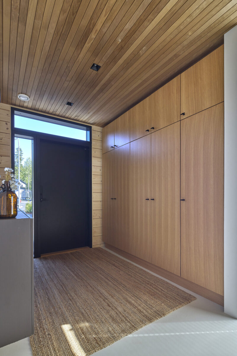 Nyt kun koti on valmis, perhe nauttii siitä, että arki sujuu ja tilat vastaavat heidän tarpeitaan. Kodinhoitohuoneen kaapit on mitoitettu tarkkaan, jotta kaikki tila hyödynnetään ja siellä on myös Hennan toivoma silitysrautakaappi. Eteisessä ja makuuhuoneissa laatikostot pitävät tavarat järjestyksessä.