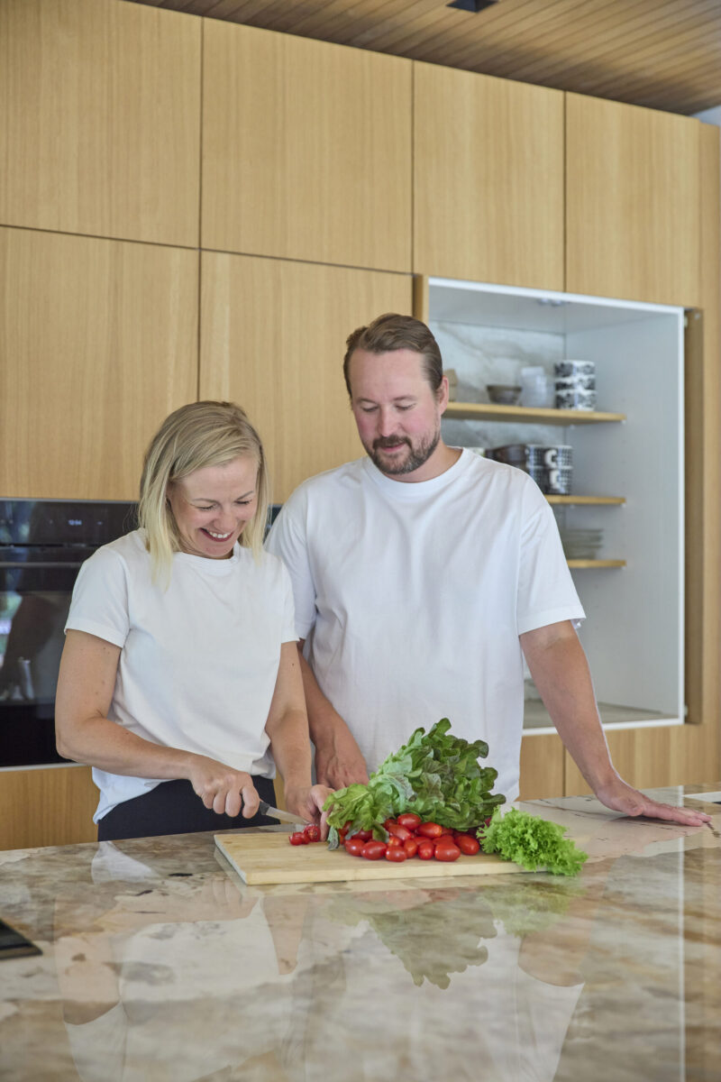 Rakennusprojektin keskellä oli selvää, että keittiöön haluttaisiin panostaa erityisesti. Avoin tila teki siitä kodin sydämen ja sen haluttiin olevan sekä käytännöllinen että kaunis katsella. Henna kertoo hymyillen yhdestä ratkaisusta, joka oli hänelle kaikkein tärkein: ”Voi kuulostaa hassulta, mutta minulle oli aivan ehdoton juttu, että saamme integroidun kahvikoneen. Hyvä kahvi on arjen luksusta ja sen ympärille rakentui koko kalusteseinä.”