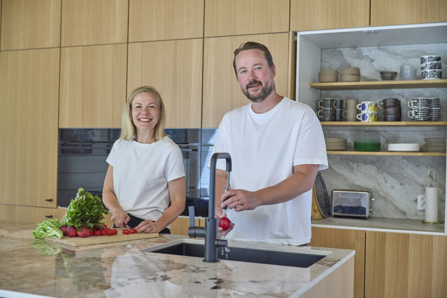 Kokonaisuuden suunnittelussa ei menty helpoimman kautta. Kaappien linjojen piti täsmätä täydellisesti ja saarekkeeseen etsittiin pitkään oikeaa ratkaisua, jotta ulkonäkö ja käytännöllisyys kulkisivat käsi kädessä. ”Siinä kyllä jumpattiin vaihtoehtoja ja mietittiin, miten saadaan linjat suoraan ja kaikki toimimaan. Mutta se kannatti – lopputulos on juuri sellainen kuin toivoimme”, Ossi muistaa.