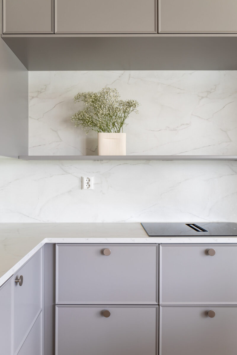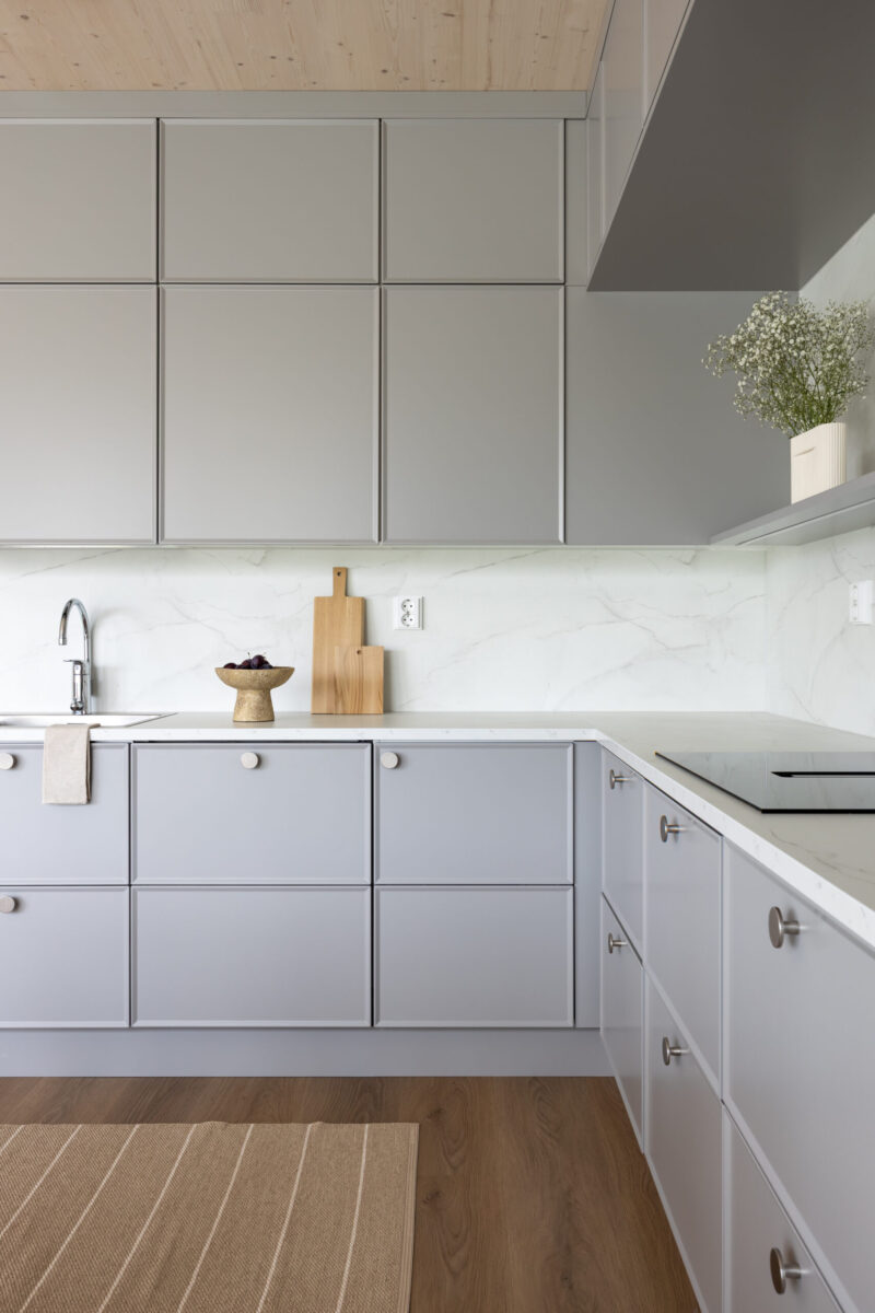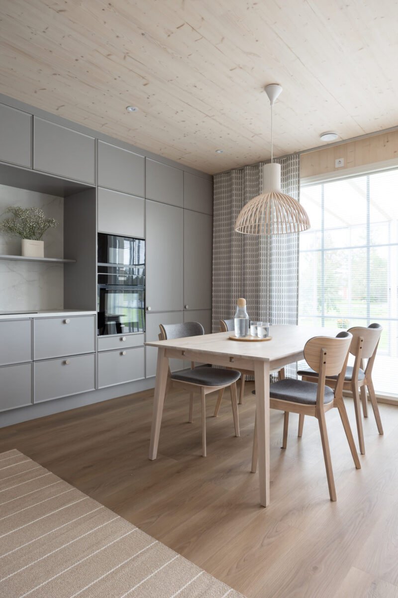 Harmoninen vaaleanharmaa keittiö on tyylikäs ja yhtenäinen kokonaisuus, jonka persoonallisuuden luovat kauniit kehysovet. Tämä suuri ja toiminnalliseksi suunniteltu keittiö kutsuu ympärilleen ruoanlaittoon.