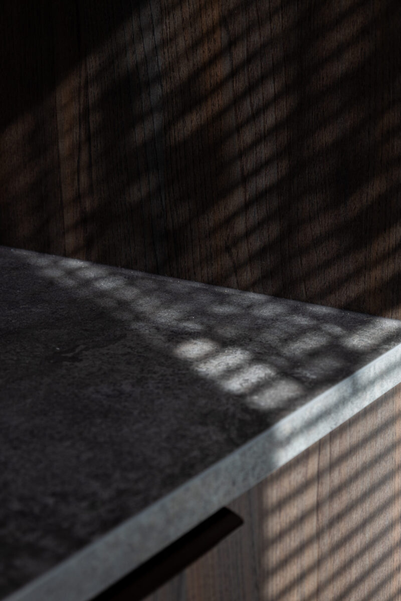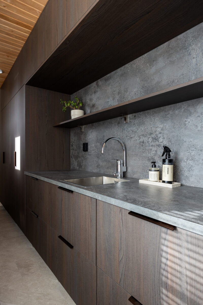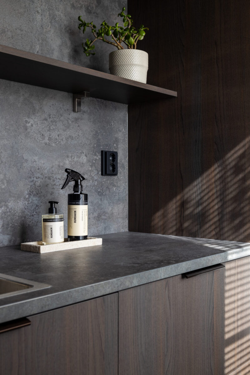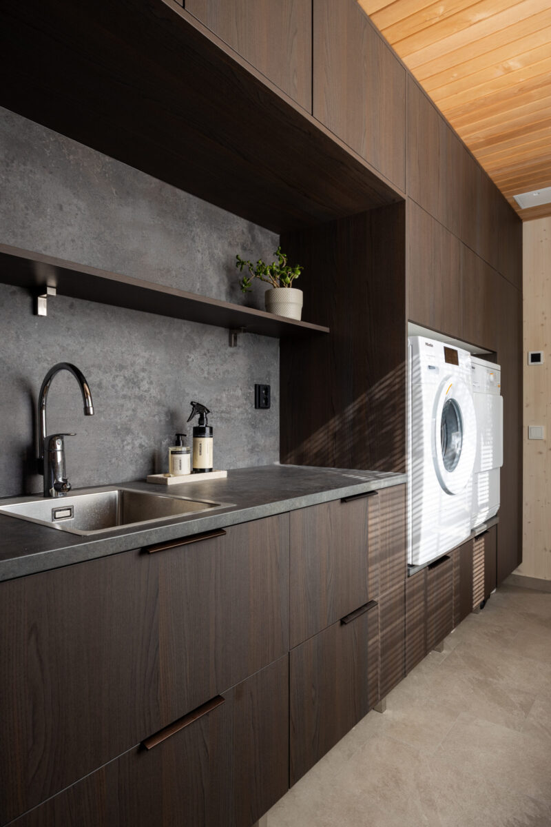 Tunnelmallinen kodinhoitohuone on toteutettu samasta materiaalista keittiön kanssa, mikä luo kotiin yhtenäisen ilmeen. Kodinhoitohuoneessa on runsaasti säilytystilaa ja laskutilaa työskentelyn helpottamiseksi.