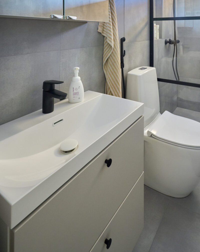 Kylpyhuoneeseen valittiin vaalea vetolaatikosto ja peilikaappi. Musta hana ja vetimet tuovat kokonaisuuteen tyylikästä kontrastia ja särmää, pitäen samalla tilan avaran tuntuisena.