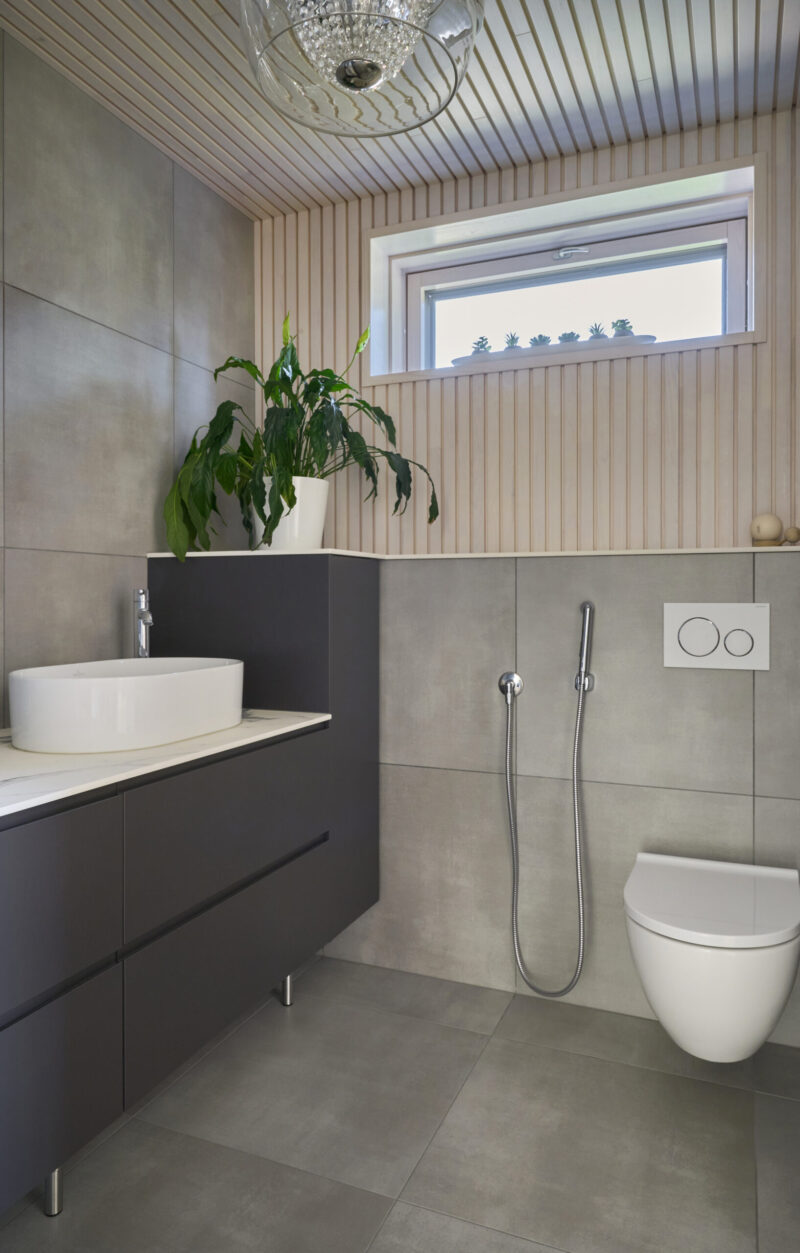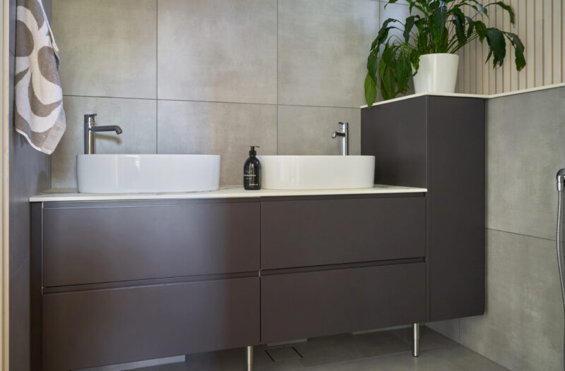Tässä kylpyhuoneessa yhdistyvät lämmin tunnelma ja moderni ilme. Toteutuksessa on hyödynnetty tummia ovia, jotka tuovat tilaan näyttävää ilmettä. Viimeistellyt yksityiskohdat, kuten kaksi allasta ja korotettu kaappi, tuovat kokonaisuuteen tilaa ja yleellisyyttä.