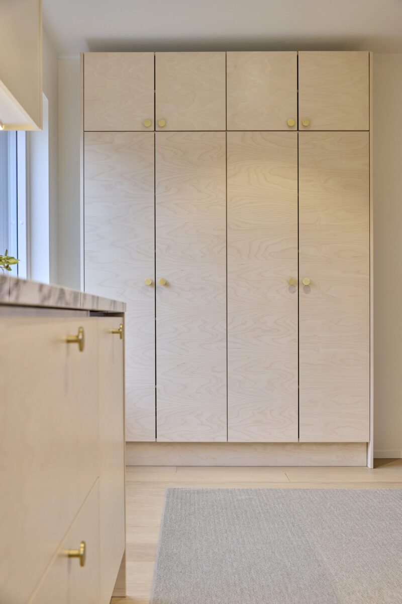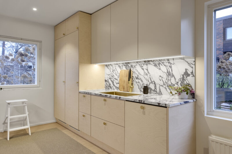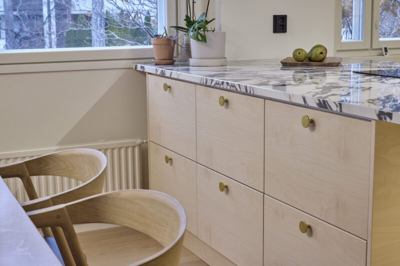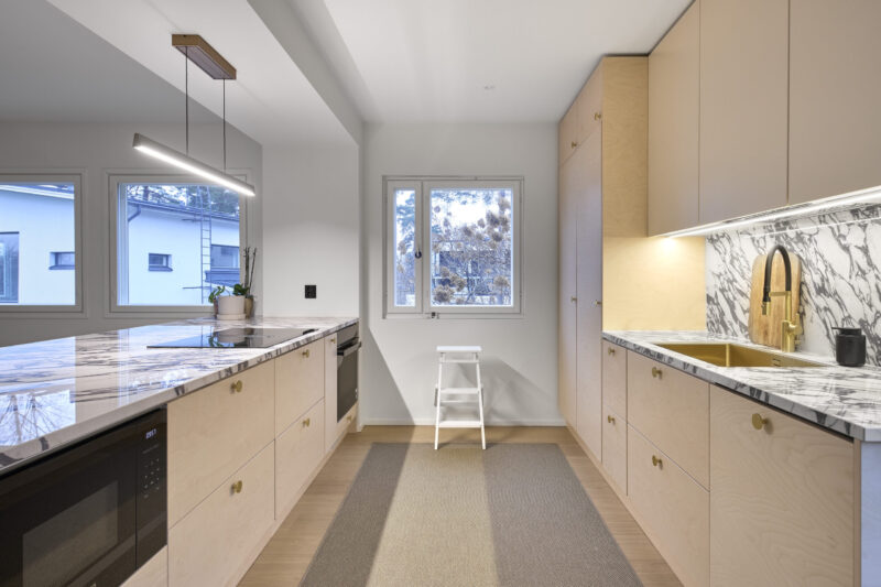 Keittiön ilmeen ja tunnelman muodostavat viiluovet, jotka tuovat tilaan luonnollista lämpöä ja pehmeyttä. Näyttävä taso luo kokonaisuuteen harkittua kontrastia ja viimeistelee ilmeen. Huolellisesti suunniteltu keittiö tarjoaa runsaasti avointa työskentelytilaa ja yhdistää toimivuuden sekä ajattoman muotoilun tasapainoiseksi kokonaisuudeksi.