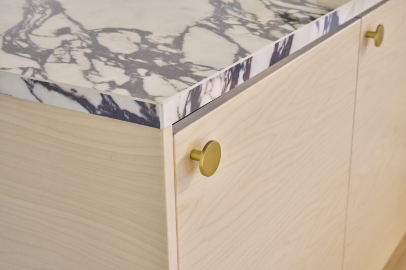 Saarekkeen ulkopuoli on otettu tehokkaasti käyttöön vetolaatikoiden avulla. Kauniit viiluovet ja tyylikkäät nuppivetimet säilyttävät ilmeen yhtenäisenä ja viimeisteltynä.