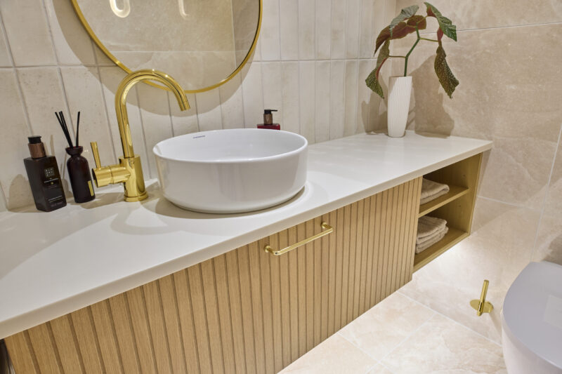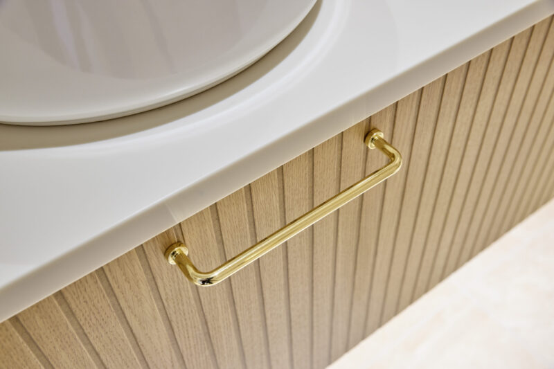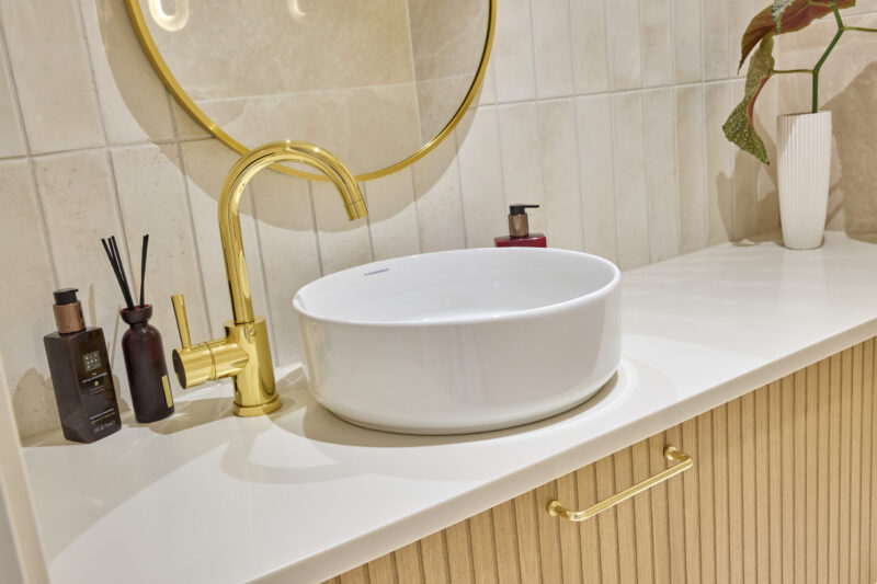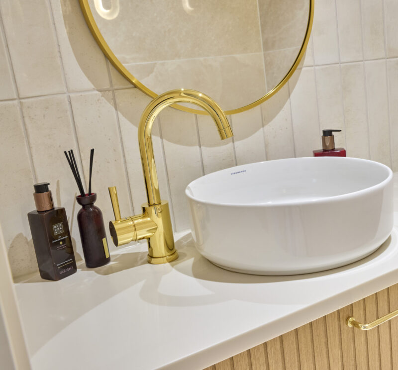 Kylpyhuoneessa yhdistyvät lämmin tunnelma ja tyylikäs ilme. Puunsävyiset ovet tuovat tilaan luonnollista pehmeyttä ja kodikkuutta, ja huolellisesti valitut kultasävyiset yksityiskohdat, kuten vetimet ja hanat, viimeistelevät kokonaisuuden. Lopputulos on ajaton ja tunnelmallinen kylpyhuone.