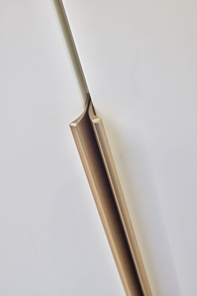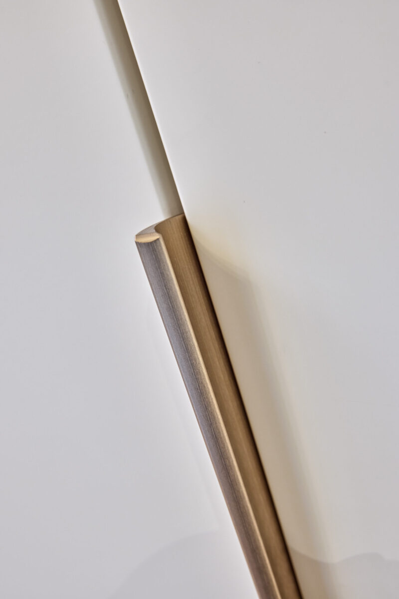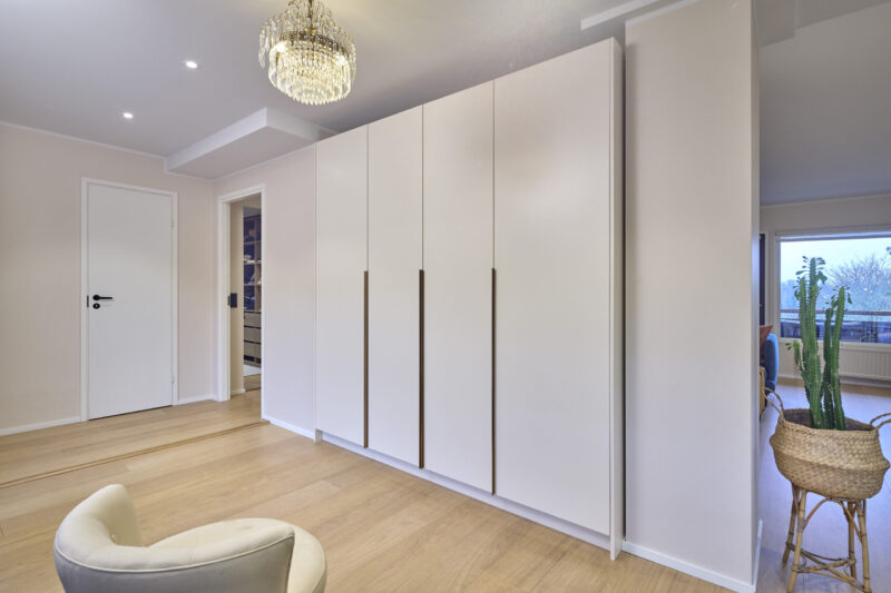 Eteisen suuret ja käytännölliset komerot on suunniteltu vastaamaan arjen säilytystarpeisiin. Vaalea sävy tuo tilaan avaruutta ja keveyttä, kun taas harkitut listavetimet lisäävät kokonaisuuteen persoonallista ilmettä. Huolellisesti toteutettu säilytysratkaisu tekee eteisestä selkeän ja toimivan, säilyttäen samalla rauhallisen ja viimeistellyn kokonaisuuden.