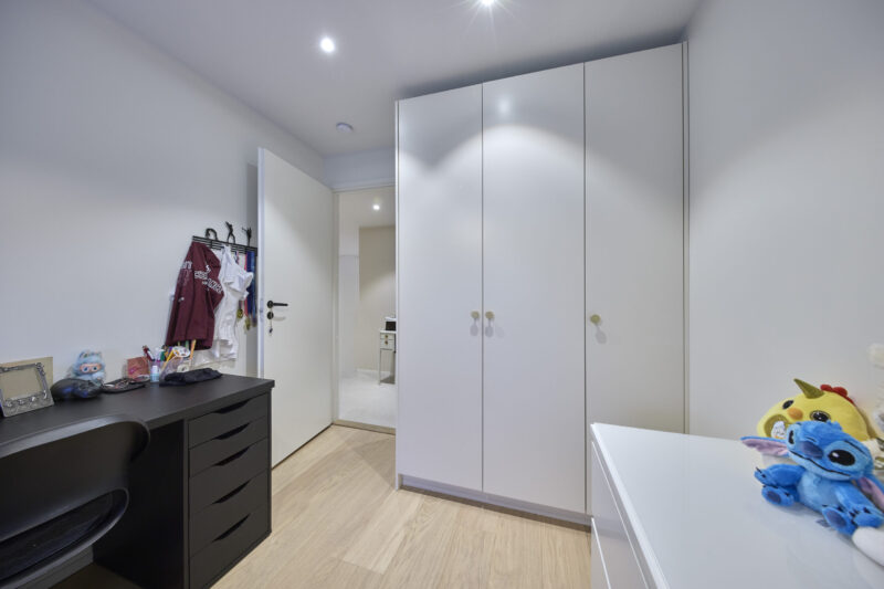 Lastenhuoneen komeroon valittiin vaaleat ovet, jotka sointuvat harmonisesti huoneen seiniin. Ilme on viimeistelty pienillä nuppivetimillä. Yhdistelmä luo huoneeseen rauhallisen ja tyylikkään tunnelman.