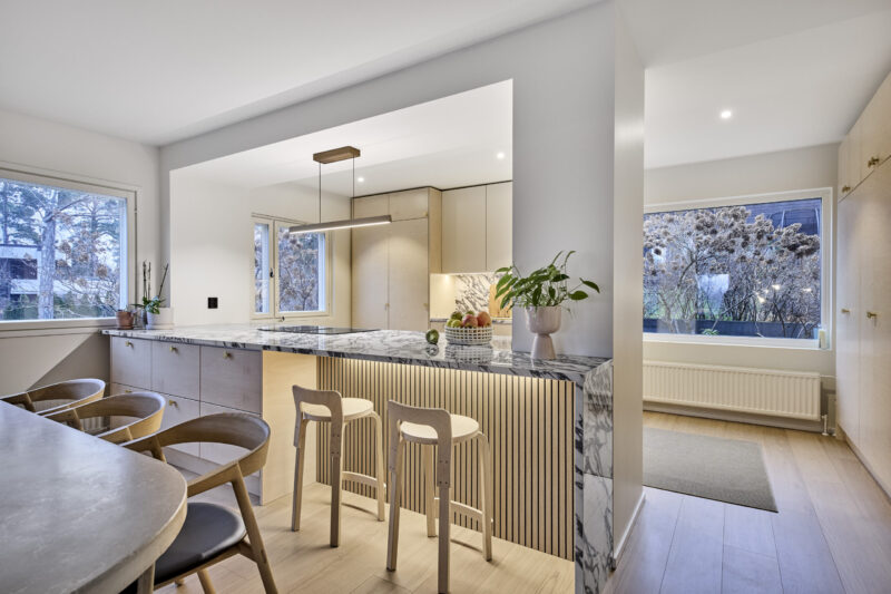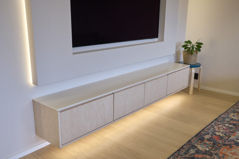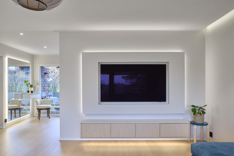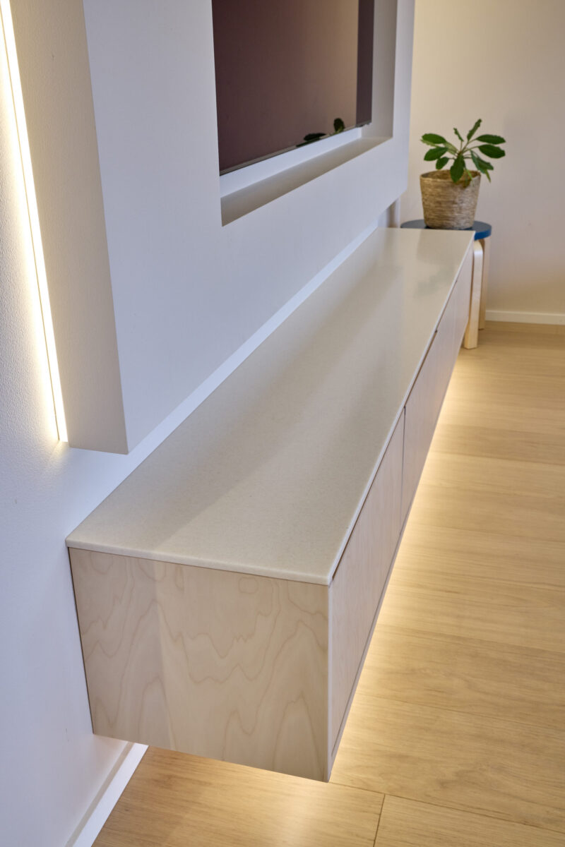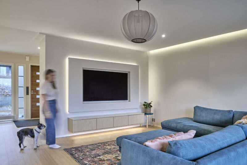 Olohuoneeseen suunniteltiin keittiön kaapinoviin sointuva viilupintainen TV-taso, joka säilyttää kodin ilmeen yhtenäisenä. Huolellisesti toteutettu TV-taso toimii tyylikkäänä mutta hillittynä osana oleskelutilaa.