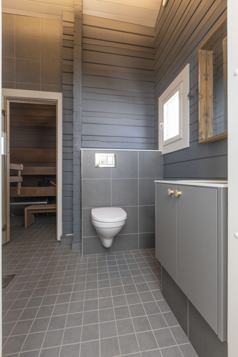 Saunarakennuksen kylpyhuoneeseen uusitut kalusteet kunnioittavat talon tunnelmaa ja sulautuvat tilaan luonnollisesti. Kalusteet on valittu huolella – sekä rungot että ovet sointuvat seinien sävyyn, jolloin kokonaisuus on rauhallinen ja lähes huomaamaton.