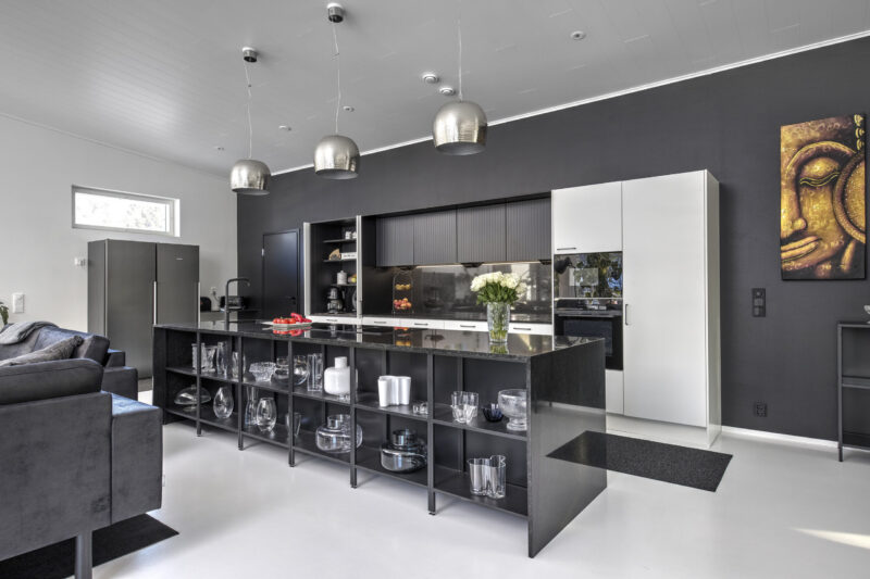 Täysin musta keittiö tekee vaikutuksen modernilla ja rohkealla ilmeellään, mutta samalla se sulautuu harmonisesti talon muuhun sisustukseen ja on lähes huomaamaton. Keittiön linjakkuus ja hillitty eleganssi eivät kilpaile tilan upean näköalan kanssa, vaan antavat sille tilaa loistaa.