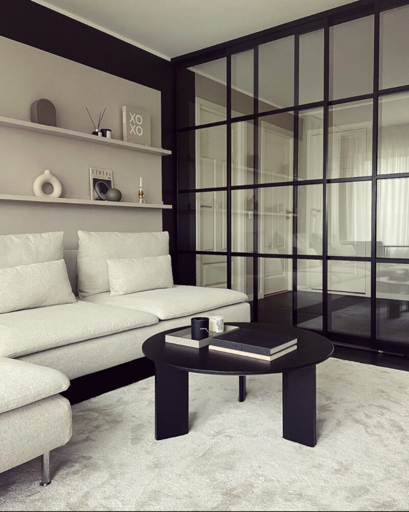 Mustat ruudut tuovat tilaan selkeää kontrastia.