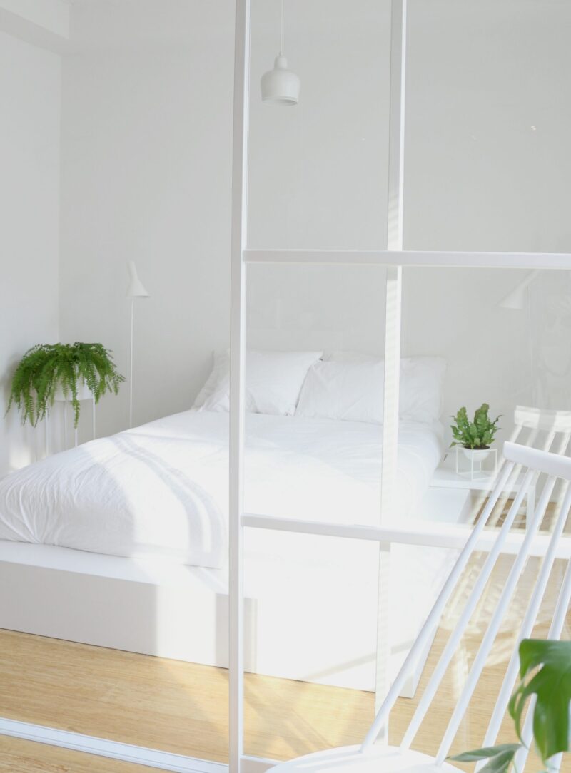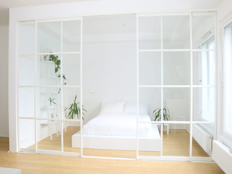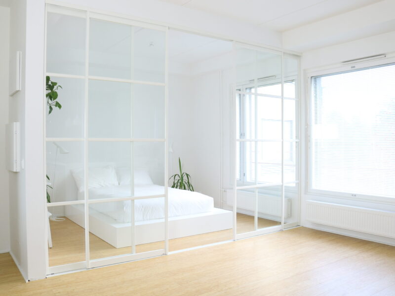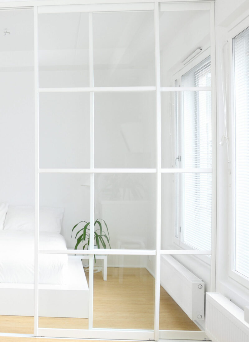 Valkoinen, kirkaslasinen tilanjakaja on raikas ja valoisa ratkaisu kotiisi. Voit sulkea ovet luodaksesi makuuhuoneesta erillisen, rauhallisen pesän. Avonaisena lasiseinä toimii kauniina, sisustuksellisena elementtinä, joka säilyttää tilan avaruuden.