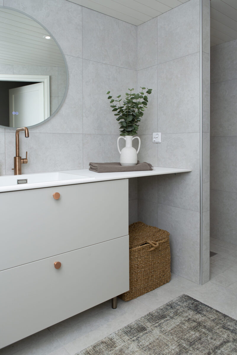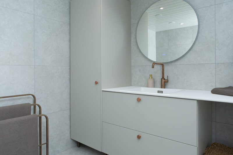 Kauniin harmoninen vaalea kylpyhuone yhdistää käytännöllisyyden ja runsaan kaappitilan huolellisesti suunnitellussa kokonaisuudessa.