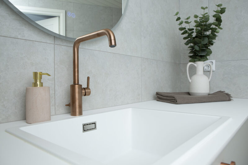 Harjatun kuparin värinen hana on elegantti yksityiskohta, joka täydentää kokonaisuuden. täydellisesti