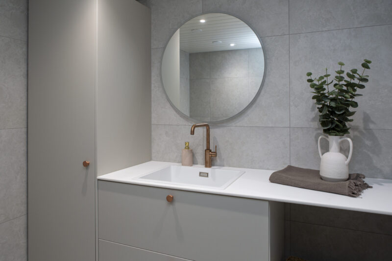Tason alle sijoitettu pesukone hyödyntää koko laskutilan ja säilyttää kokonaisuuden selkeänä.