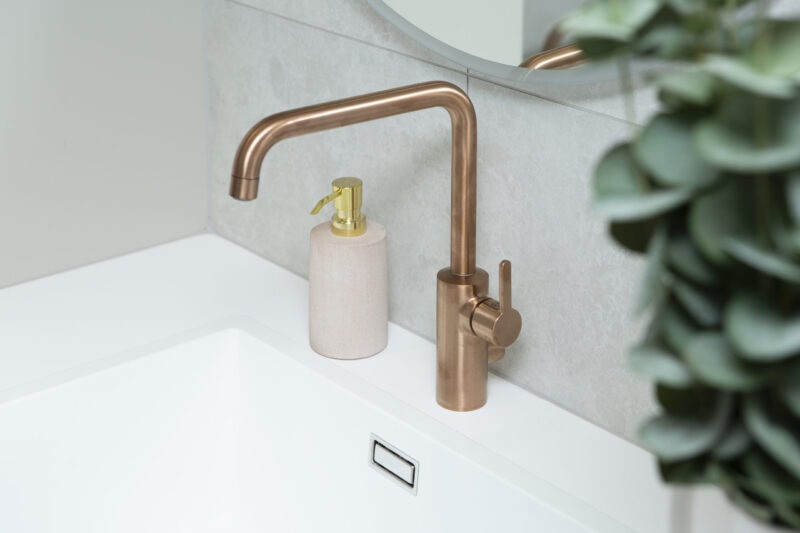 Harjatun kuparin värinen hana on elegantti yksityiskohta, joka täydentää kokonaisuuden. täydellisesti