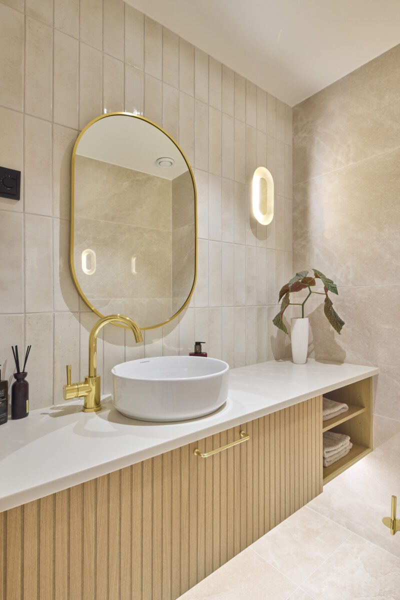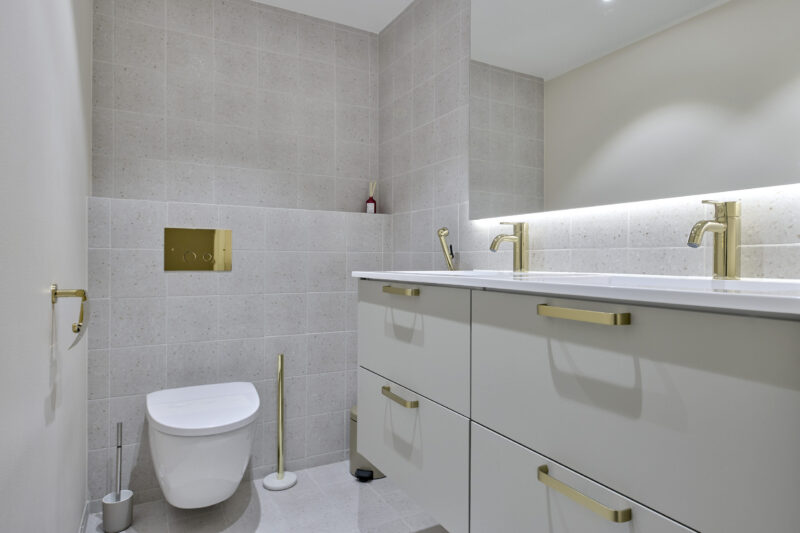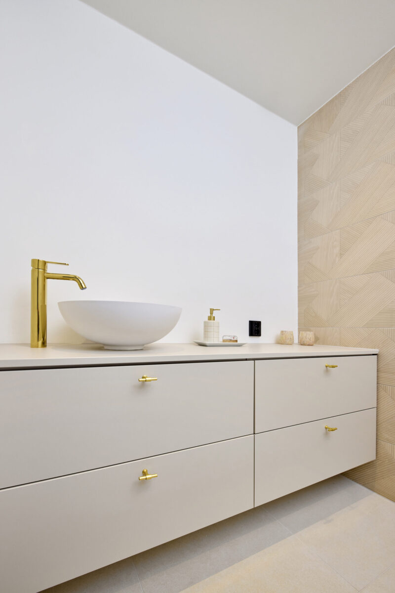 Kauniin harmoninen vaalea kylpyhuone yhdistää käytännöllisyyden ja runsaan kaappitilan huolellisesti suunnitellussa kokonaisuudessa.