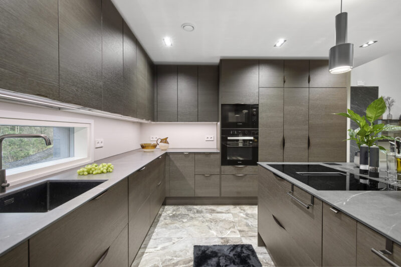 Selkeälinjainen tummasävyinen keittiö