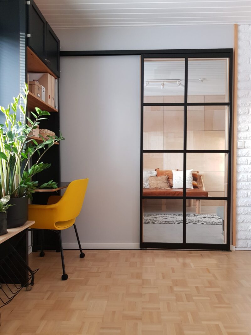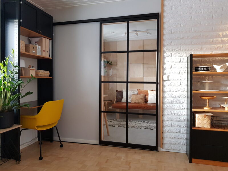 Tämä lasinen tilanjako-ovi on täydellinen ratkaisu työhuoneen ja oleskelutilan väliin. Se toimii kauniina sisustuselementtinä myös avattuna, mutta tarvittaessa luo työhuoneesta rauhallisen tilan rikkomatta kodin avaraa ja valoisaa tunnelmaa.