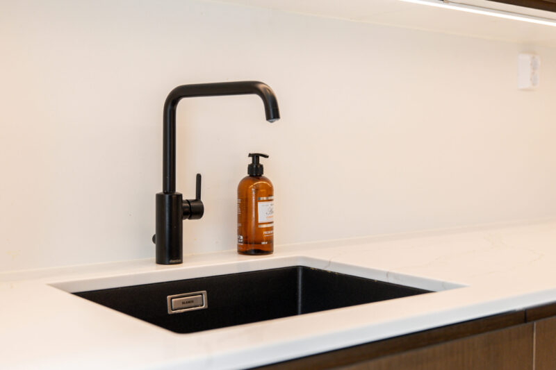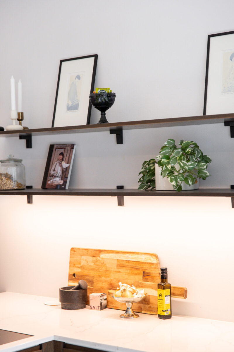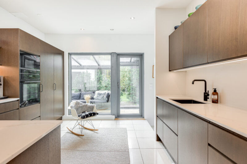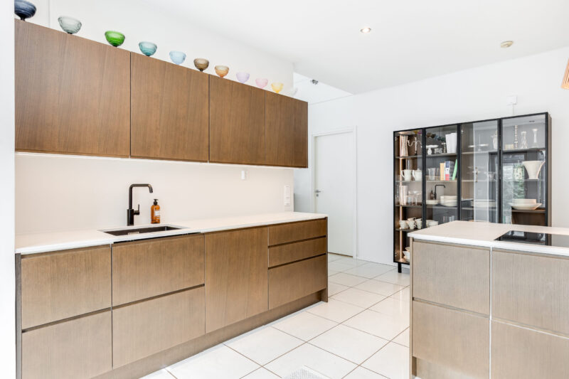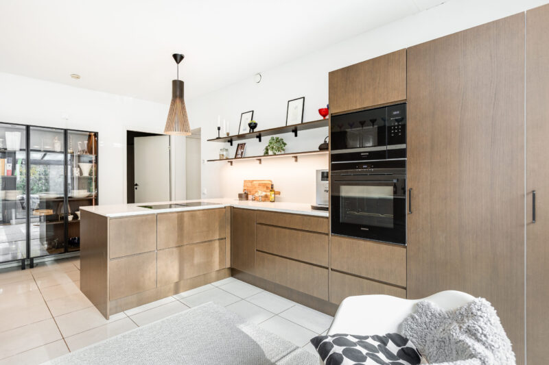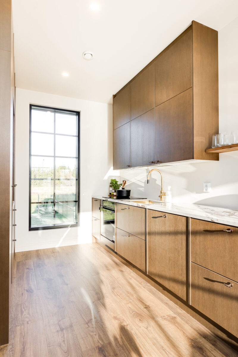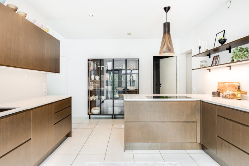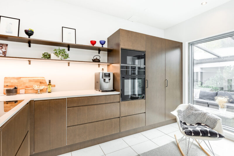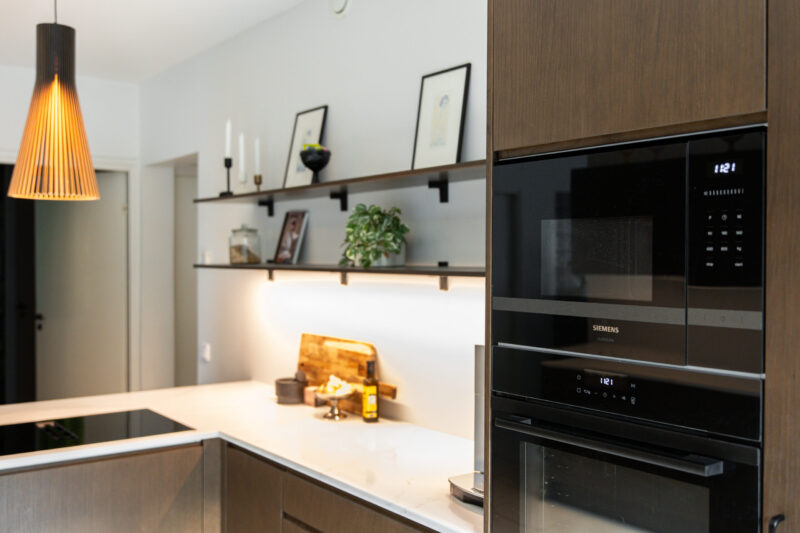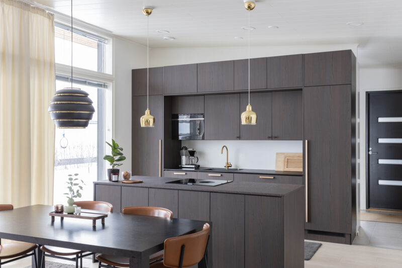 Tummanruskea keittiö on tilava ja avara kokonaisuus, joka on hyvän suunnittelun ansiosta erittäin toimiva. Osa yläkaapeista on korvattu avohyllyillä, mikä lisää tilan keveyttä ja avaruuden tuntua. Integroidut kodinkoneet tekevät kokonaisuudesta yhtenäisen. Huolellisesti suunnitellut ratkaisut tukevat sujuvaa arkea ja viimeistelevät keittiön harmonisen ilmeen.