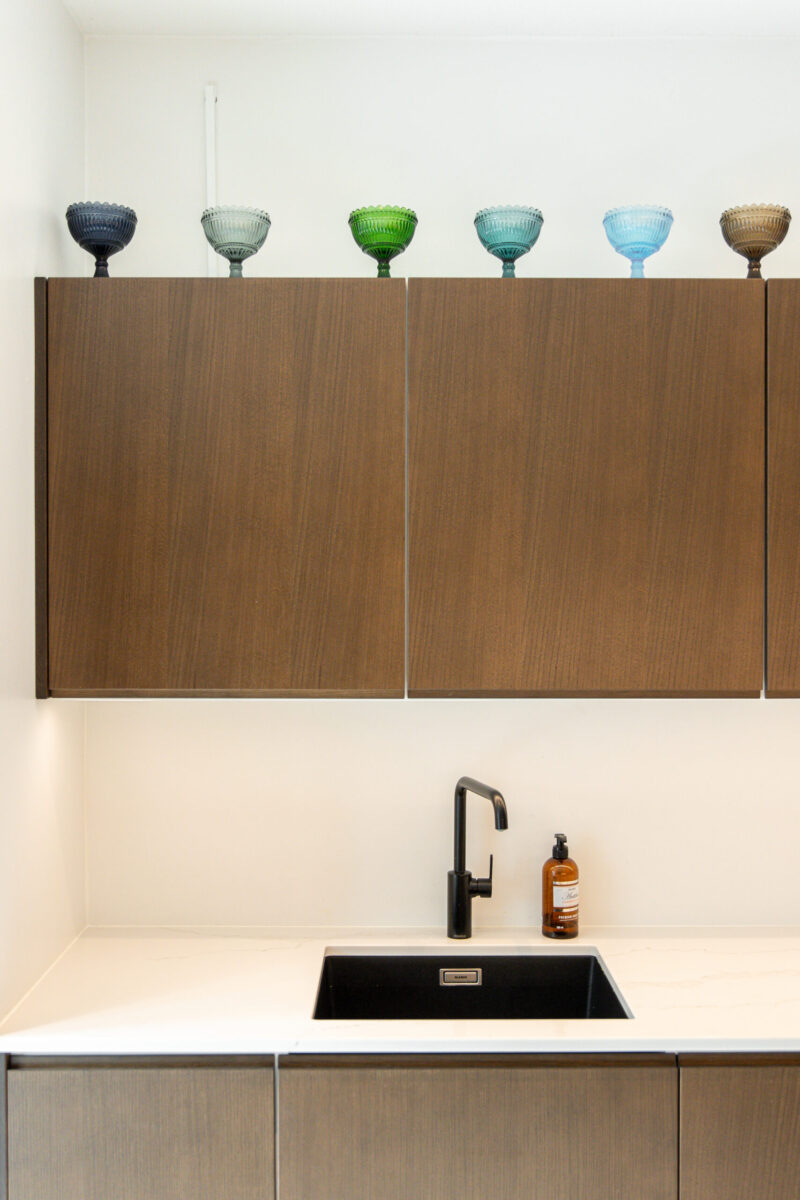 Puunsävyiset, tummanruskeat ovet lisäävät tilaan luonnollista lämpöä ja pehmeyttä.