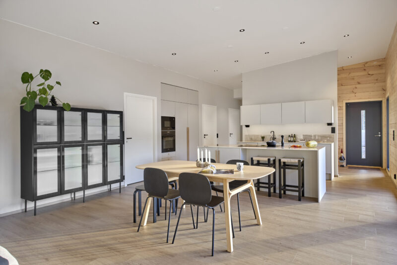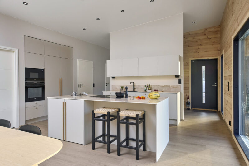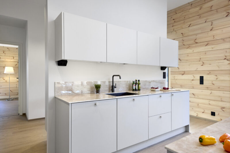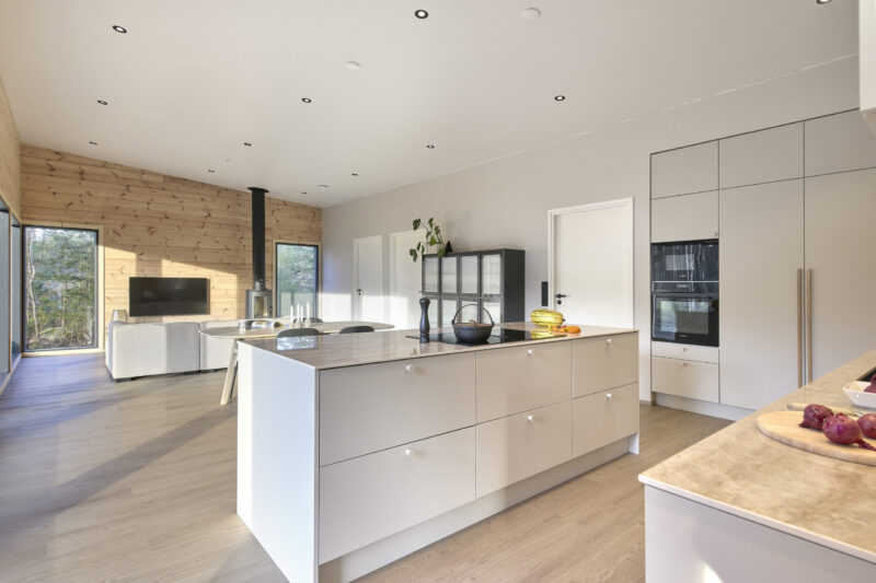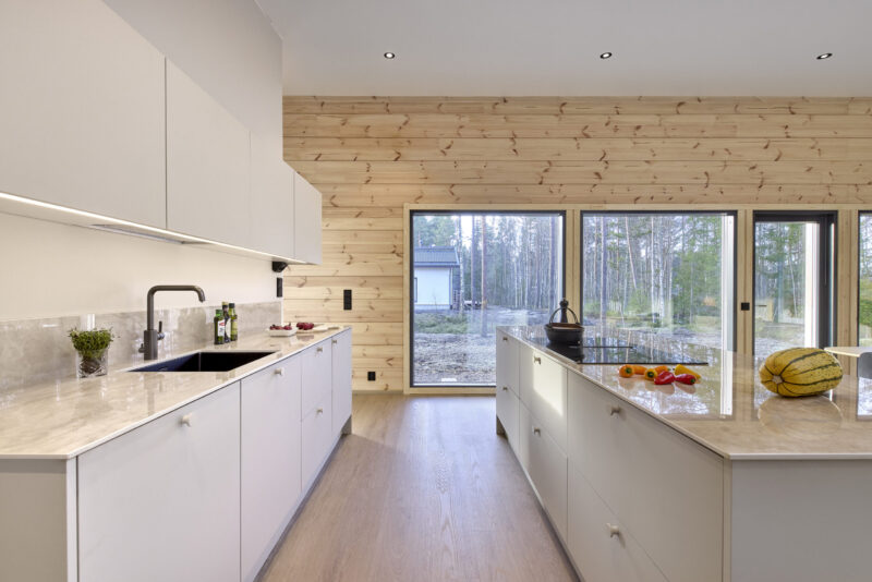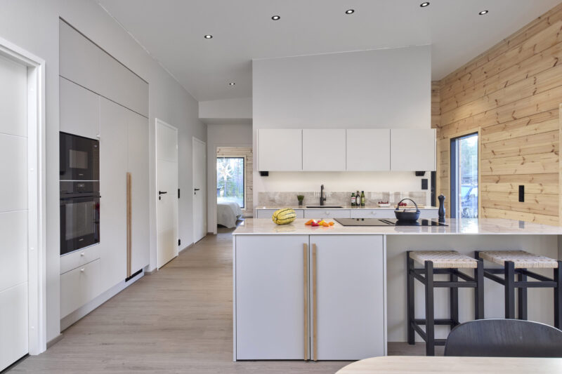 Vaalea ja talon luonnonläheisiin hirsiseiniin kauniisti yhdistyvä keittiö on suunniteltu nerokkaasti tilaan sopivaksi. Runsaat säilytystilat ja integroidut kodinkoneet luovat yhtenäisen ja selkeän ilmeen. Suuri saareke tekee keittiöstä sekä käytännöllisen että näyttävän kokonaisuuden.