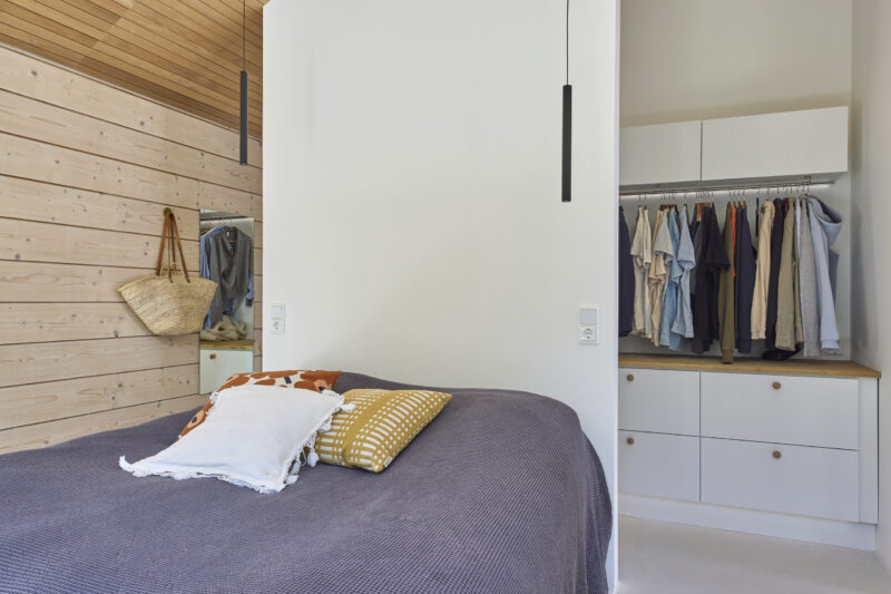 Makuuhuoneeseen yhdistetty vaatehuone on tyylikäs ratkaisu, joka tarjoaa runsaan säilytystilan vaatteille. Vetolaatikoiden ja avorekkien tarkalla suunnittelulla on luotu erittäin käytännöllinen kokonaisuus, joka sointuu täydellisesti kodin sisustukseen.