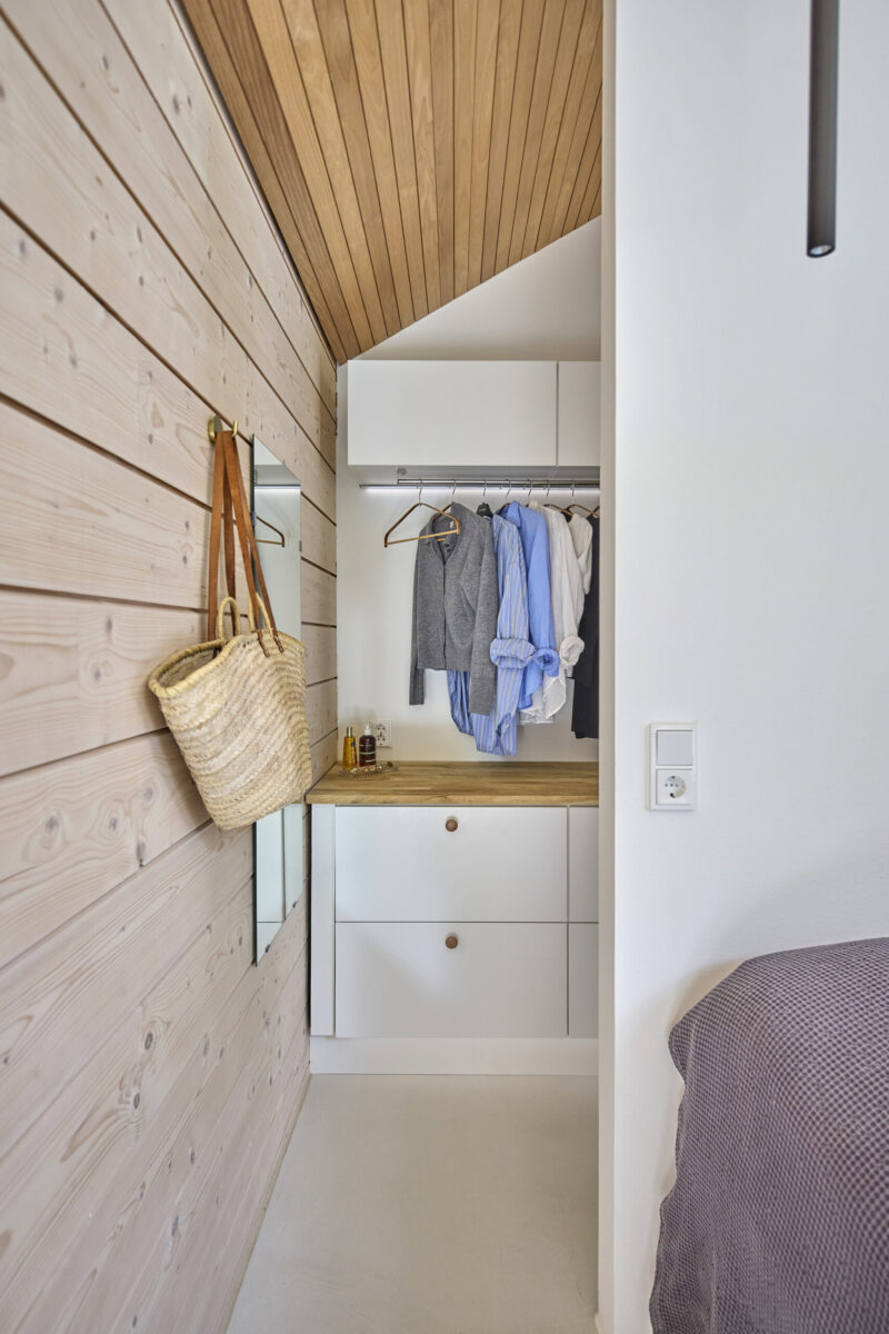 Vaatehuoneen runkojen asettelu mahdollisti leveät vetolaatikot sekä käytännöllisen laskutilan.