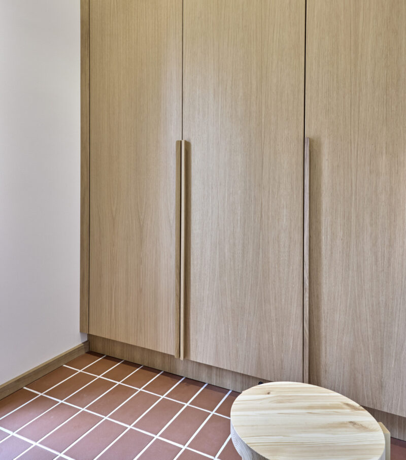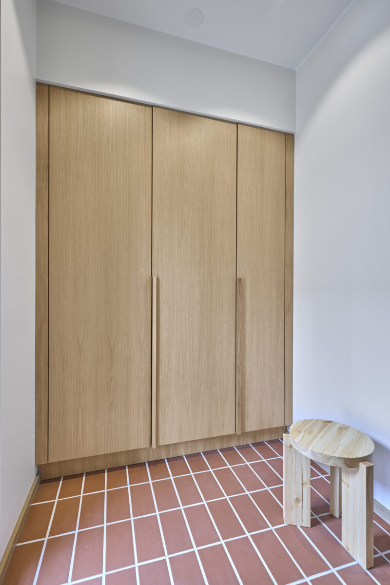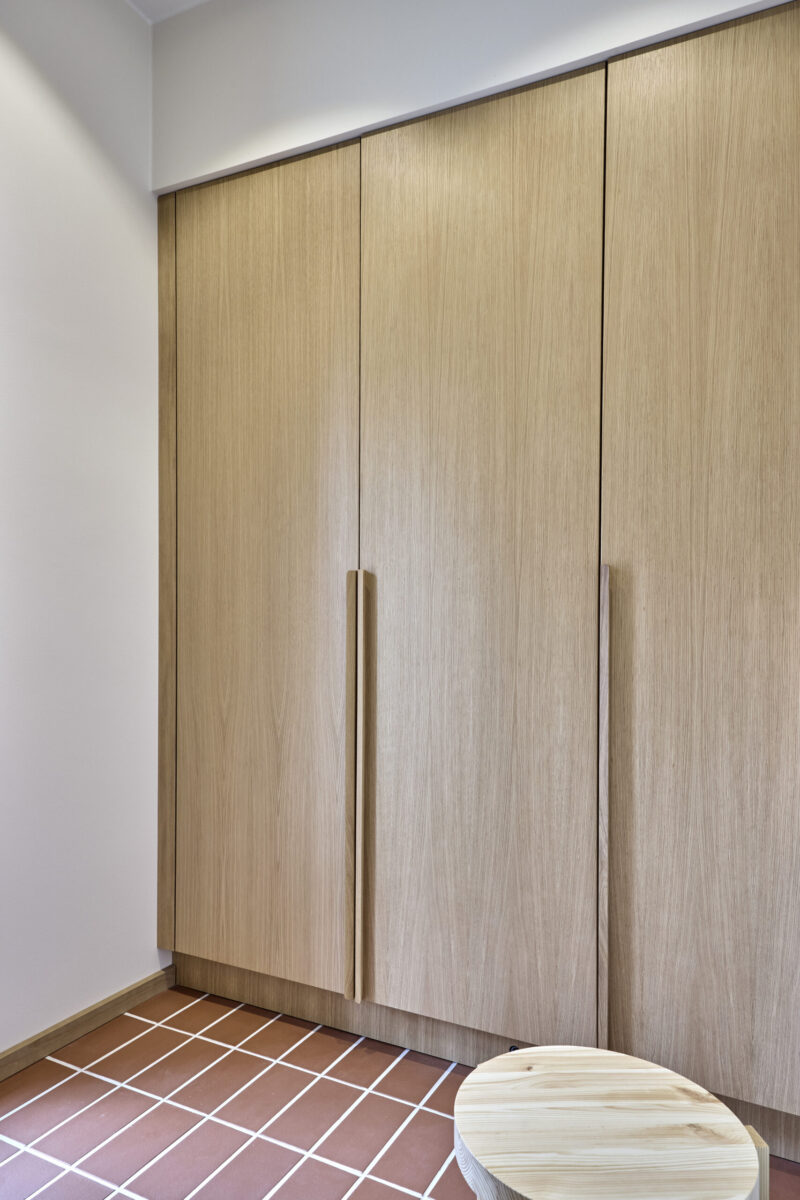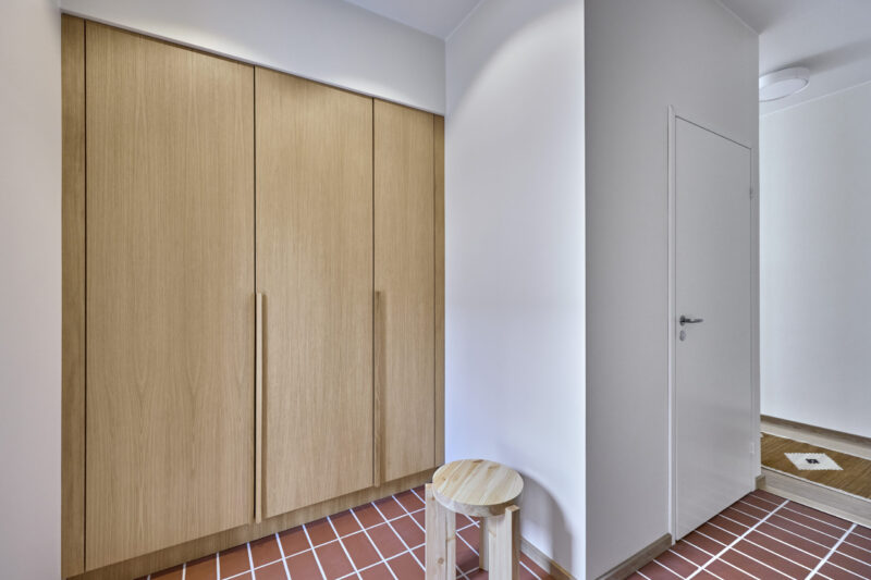 Kodin eteiseen suunniteltiin tyylikkäät komerot, jotka kätkevät sisäänsä runsaasti säilytystilaa. Näyttävä ulkoasu yhdistyy käytännöllisyyteen, ja kokonaisuus pitää arjen tavarat siististi piilossa – eteinen pysyy rauhallisena ja selkeänä.