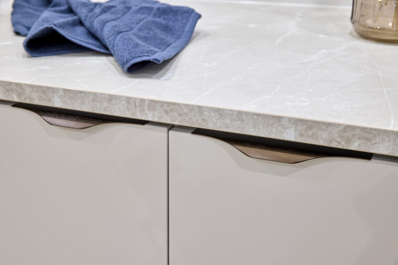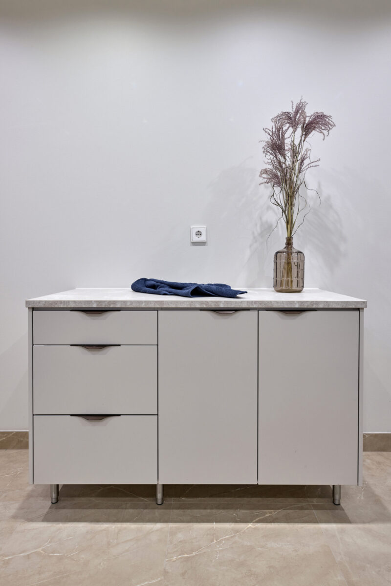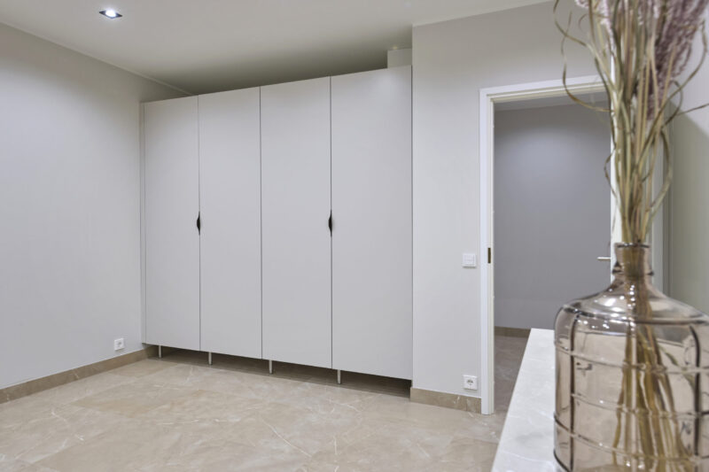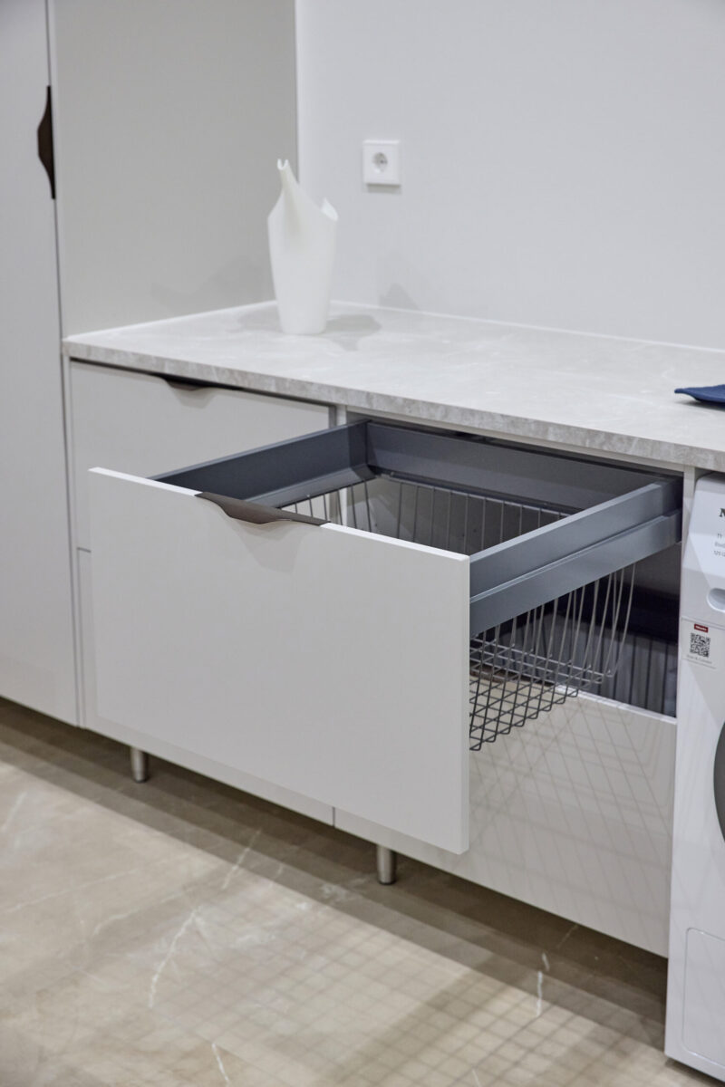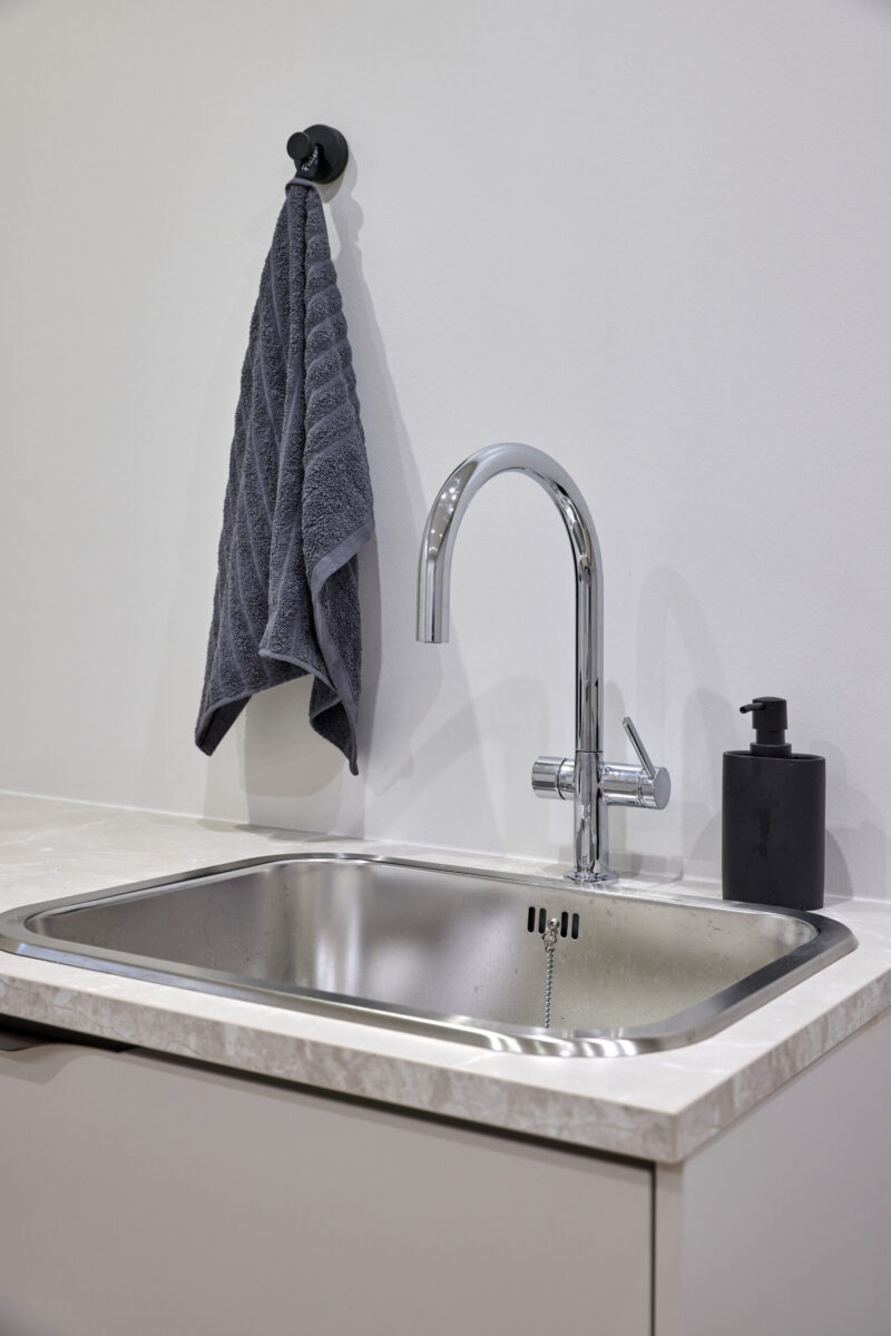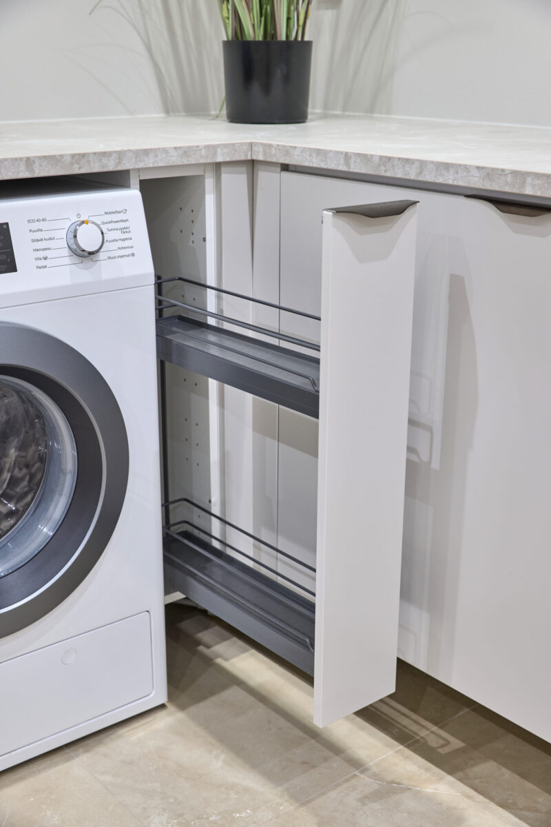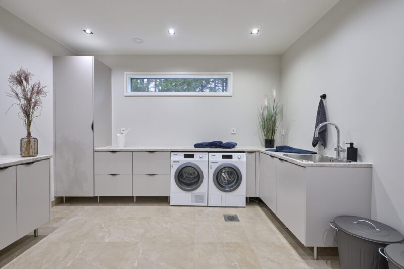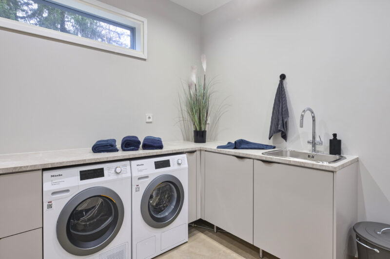 Tilava kodinhoitohuone tarjoaa runsaasti säilytys- ja laskutilaa, mikä tekee arjen askareista sujuvia. Harmoninen värimaailma ja selkeä kokonaisuus luovat rauhallisen ja toimivan tilan päivittäiseen käyttöön.