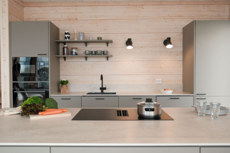 Harmoninen keittiö on tyylikäs ja yhtenäinen kokonaisuus. Hyvin suunniteltu keittiö tarjoaa runsaasti säilytystilaa, vaikka osa yläkaapeista on jätetty pois avaruuden tunteen säilyttämiseksi. Suuri saareke toimii ruoanlaiton keskipisteenä, jossa upeat maisemat viimeistelevät kokkaushetken.